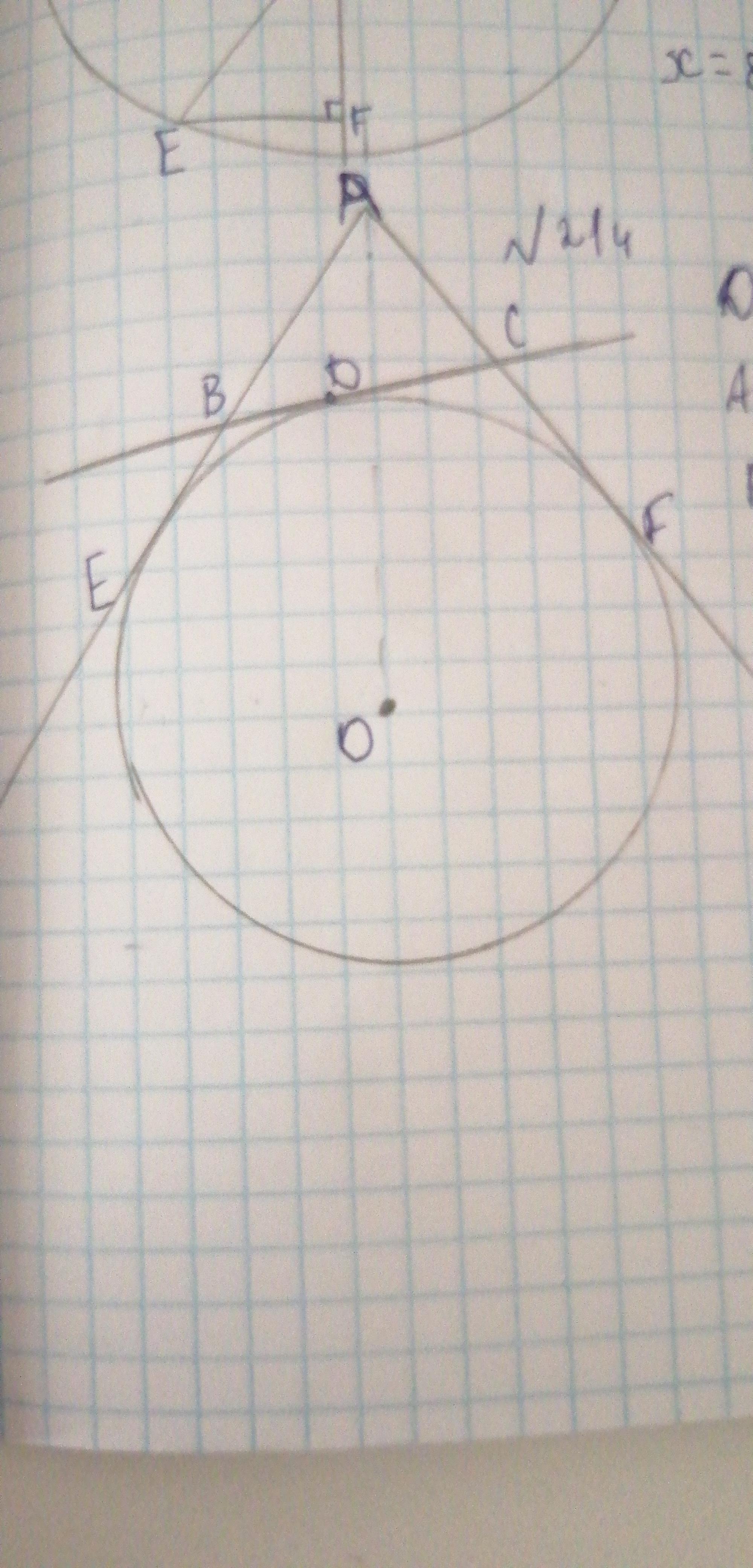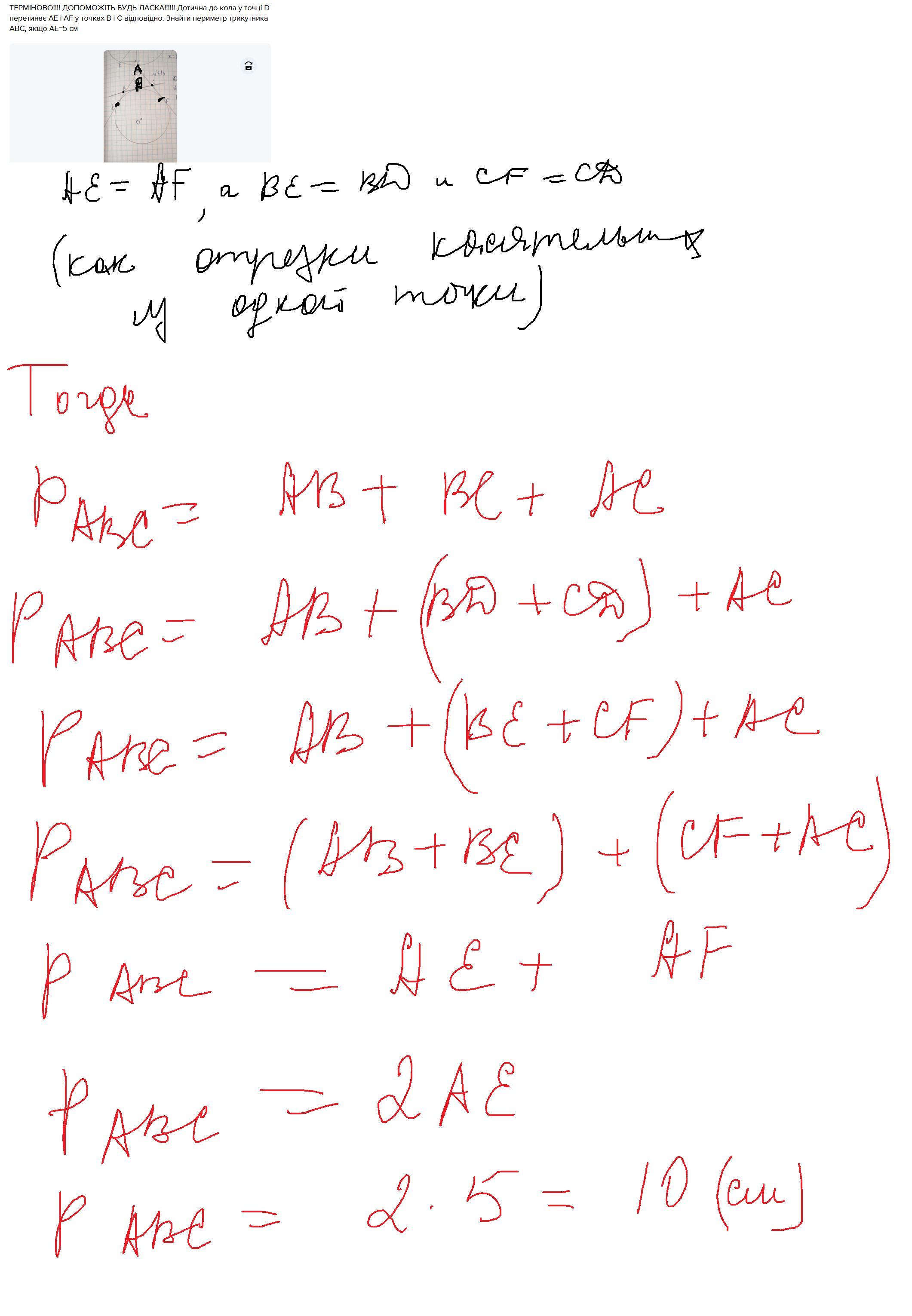 ТЕРМІНОВО!!!! ДОПОМОЖІТЬ БУДЬ ЛАСКА!!!!!! Дотична до кола у точці D перетинає AE і AF у точках B і C відповідно. Знайти периметр трикутника ABC, якщо AE=5 см