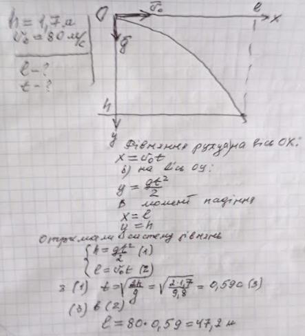 Український спортсмен, олімпійський чемпіон зі стрільби з лука Віктор Рубан ,на тренуваннi з висоти 1,7м, в штустив горизонтально стрілу з початковою швидкістю 80м/с. Знайти дальнiсть польоту стрiли, через який інтервал часу стрiла впаде на землю? Опором повітря знехтувати.