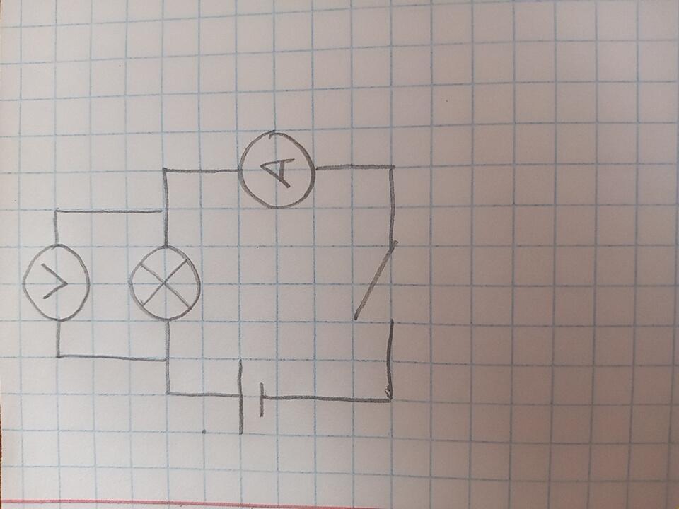 Нарисуйте электрическую схему, соединив последовательно источник тока, лампу, амперметр, ключ, а вольтметр – параллельно лампе.