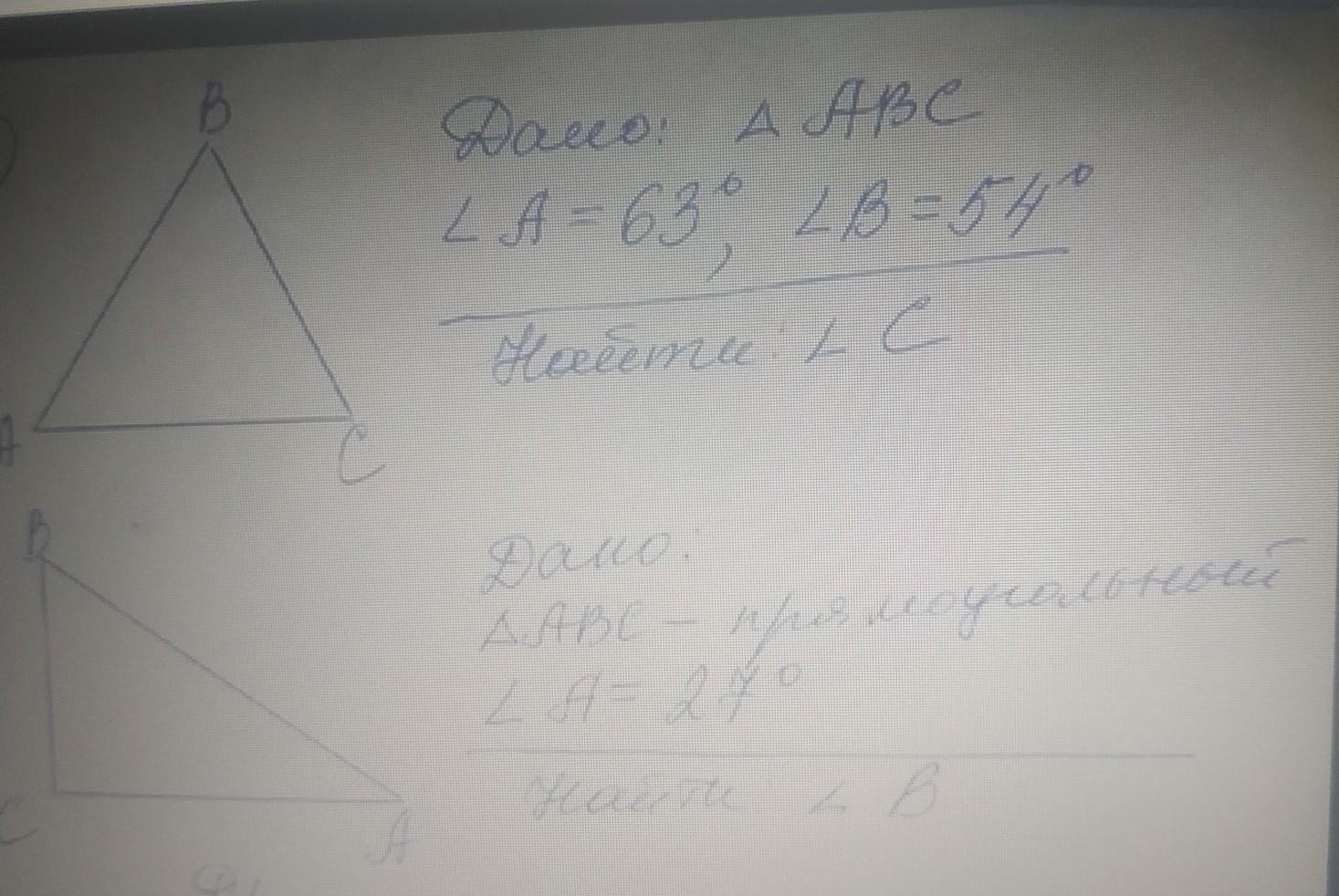 Сумма углов в треугольнике АВС равна 180 градусов(он равнобедренный)значит угол С=180-63-54=63 градуса