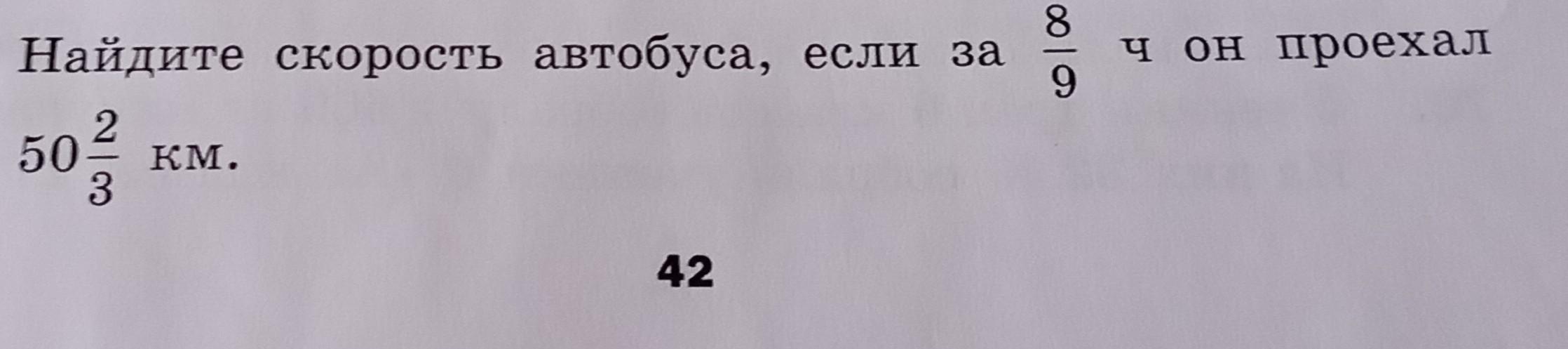 50. 2/3 : 8/9 = 152/3 * 9/8 = 19/1 * 3/1 = 57/1 = 57 (км/ч) - скорость автобуса