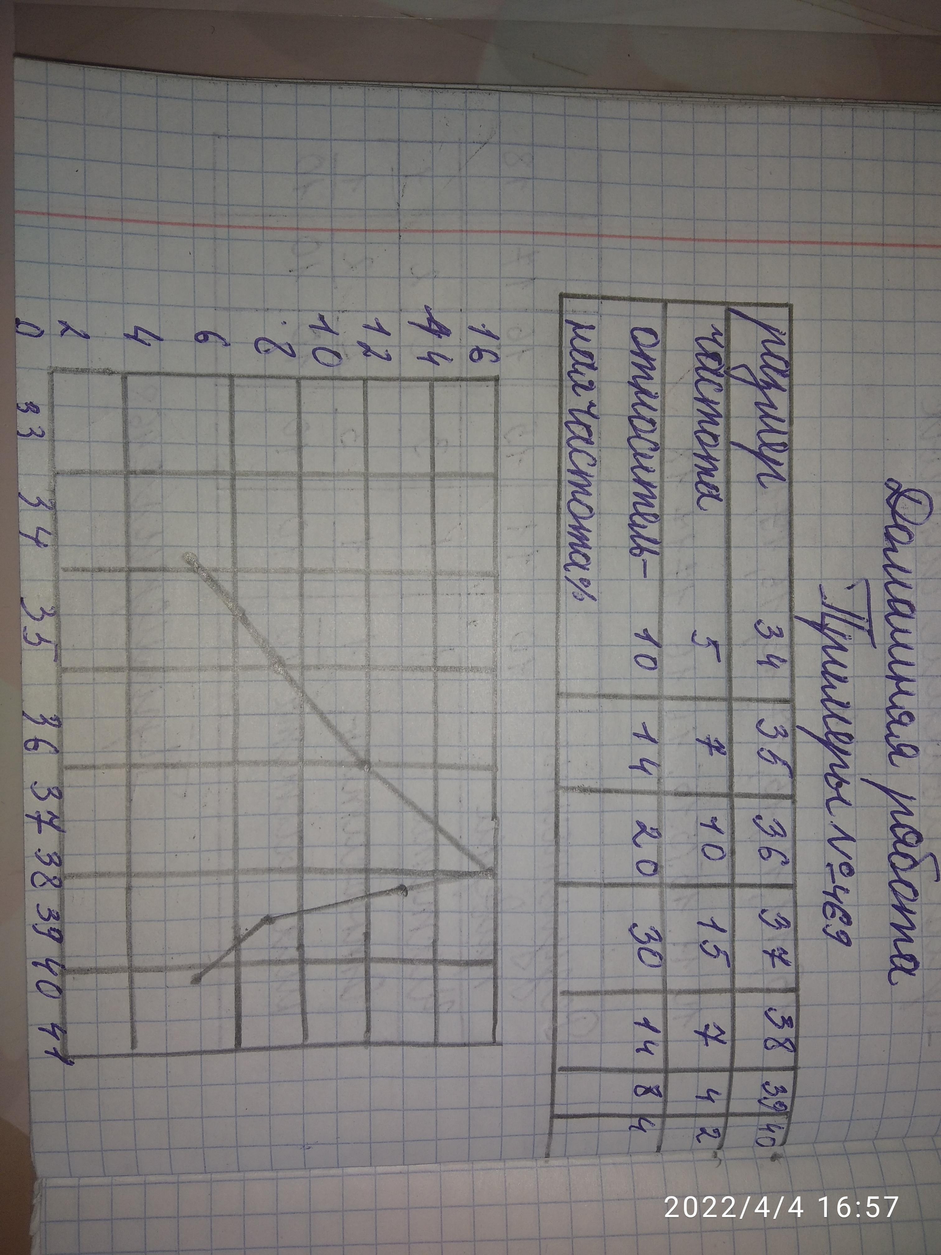 469. Приведена таблица размеров обуви с частотами призывников на военную службу: Измерения 38, 39, 40, 41, 42, 43, 44, 45. Частота 4, 4, 19, 27, 23, 14, 6,