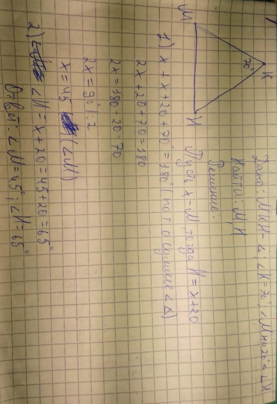 В треугольнике МНК угол К равен 70° . Найдите углы М если угол М на 20° меньше угла Н