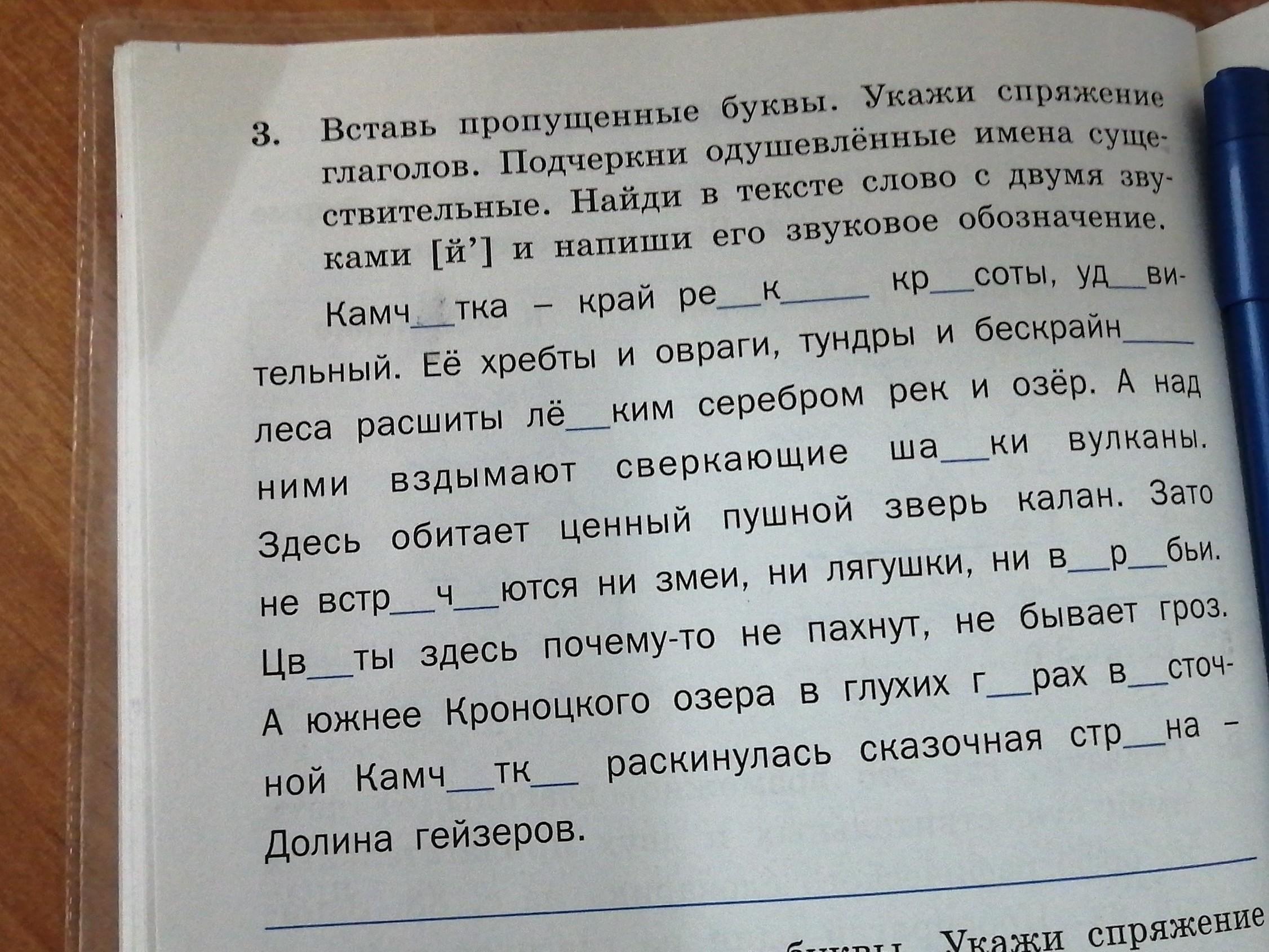 Вставь пропущенные буквы. Укажите спряжение глаголов. Подчеркните одушевлённые имена существительные. Найдите в тексте слово с двумя звуками [й'] и напиши его звуковое обозначение.