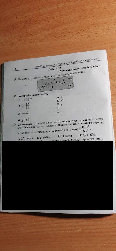 q=√(Fr²/k)=√0.2 Н×(0,05м)²÷(9*10 Н*м²/Кл²)=2,4*10⁻⁷ Кл=0,24 мкКл ⇒варіант А