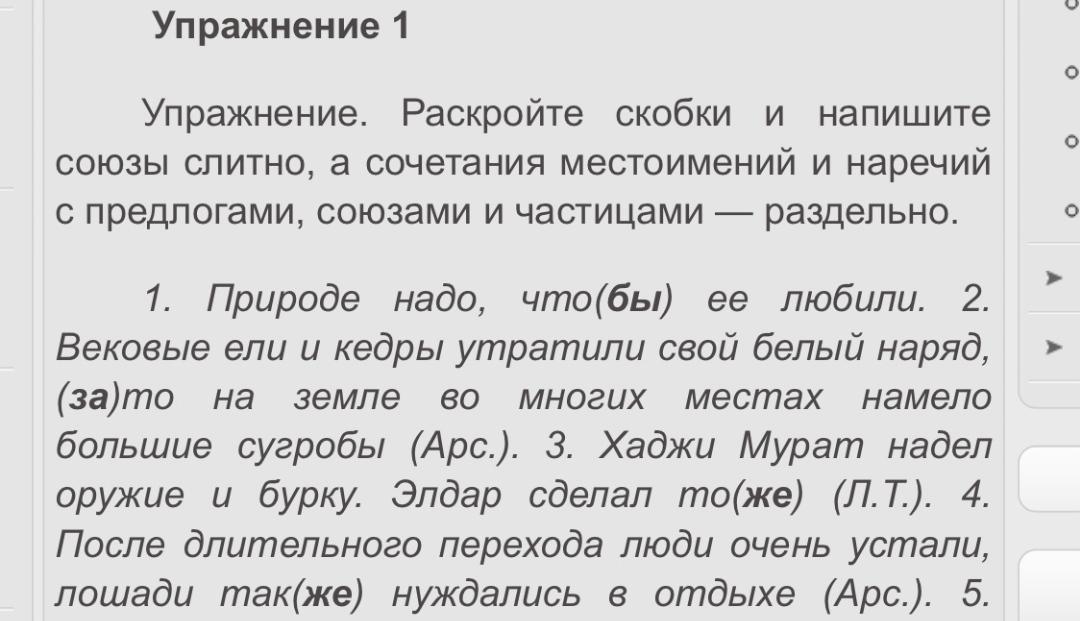 Природе нужно, чтобы ее любили. 2. Возрастные елки и кедры потеряли свой белый наряд, зато на земле во многих местах намело большие сугробы (арс.). 3. Хаджи Мурат надел оружие и бурку. Элдар сделал то же самое (Л.Т.). 4. После длительного перехода люди очень устали, лошади тоже нуждались в отдыхе (Apc.).