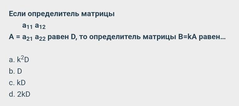 Пошаговое объяснение: каждый элемент матрицы А умножили на k, следовательно определитель матрицы увеличился в k² раз.