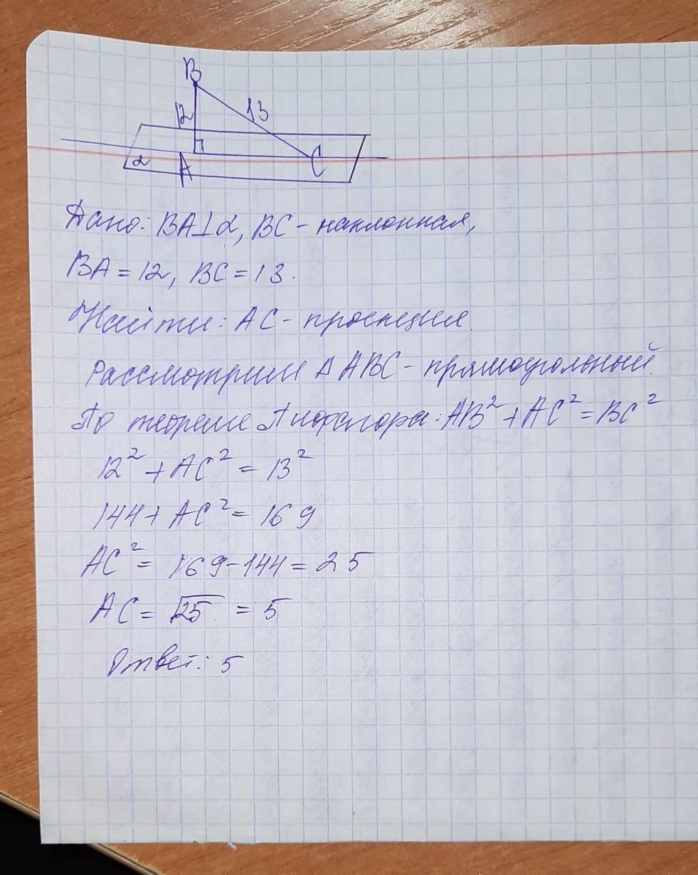 з точки р до до площини проведений перпендикуляр рс і похила ра що дорівнює 13 см. знайдіть площину проекції похилої якщо вона на 7 см довша за перпендикуляр. Допоможіть будь ласка