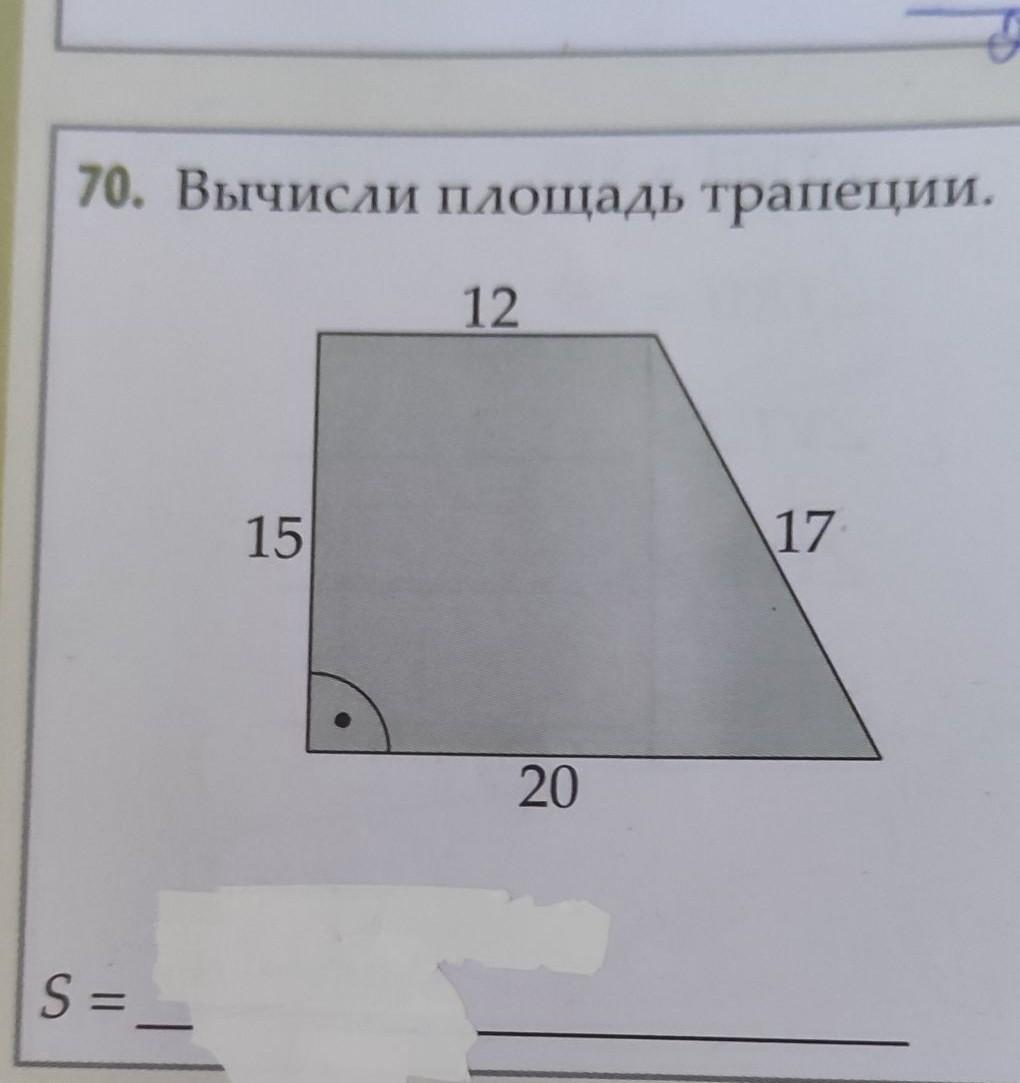 формула площади трапеции - S=1/2*h*(a+b) где a и b это основания, а аш это высота. Высота 15 , a+b=12+20=32. Получаем 1/2*32*15=240