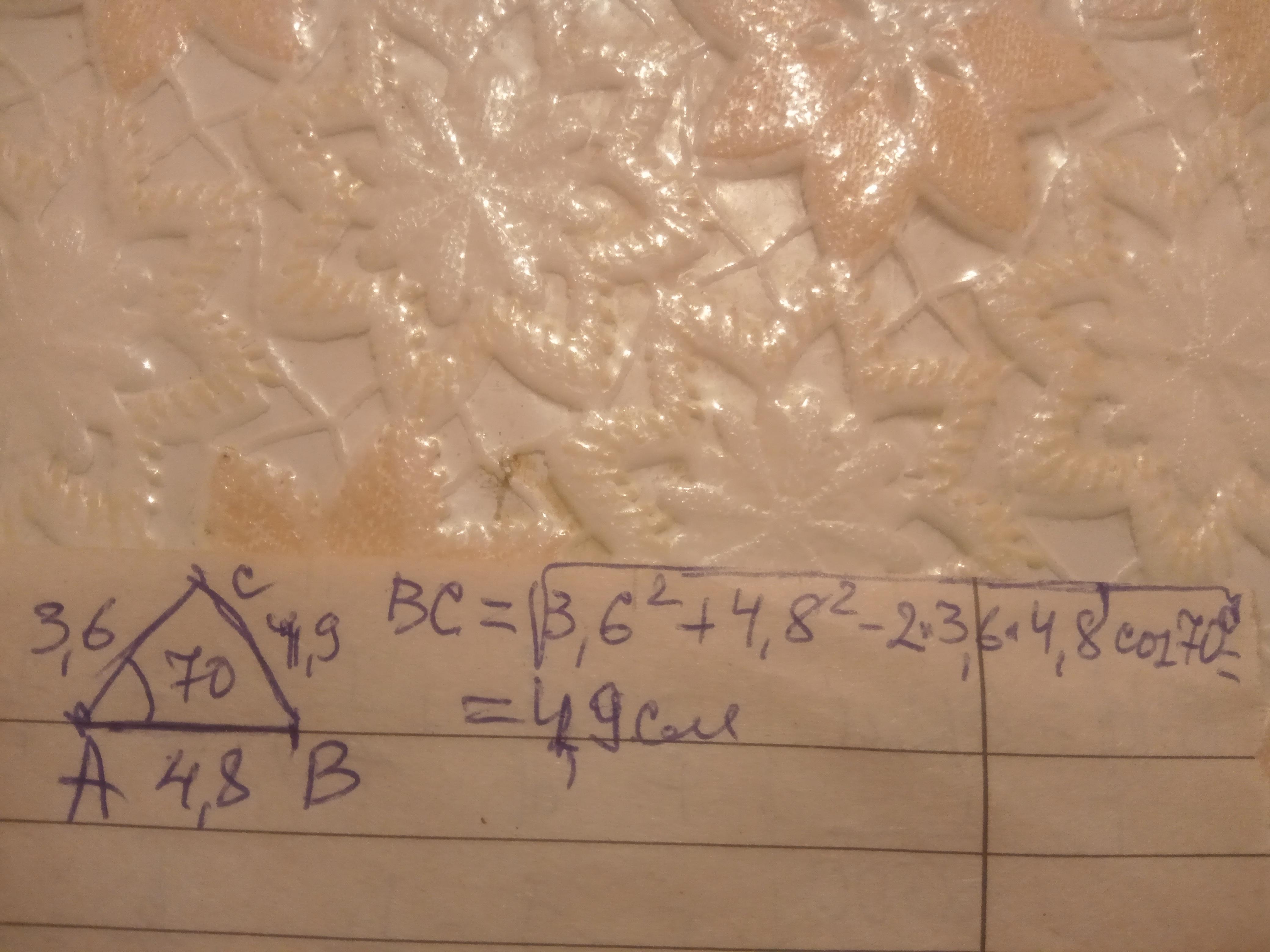 1. Две стороны треугольника 4,8 см и 3,6 см, а угол между ними равен 70°. Постройте этот треугольник и, сделав необходимые измерения, вычислите его
