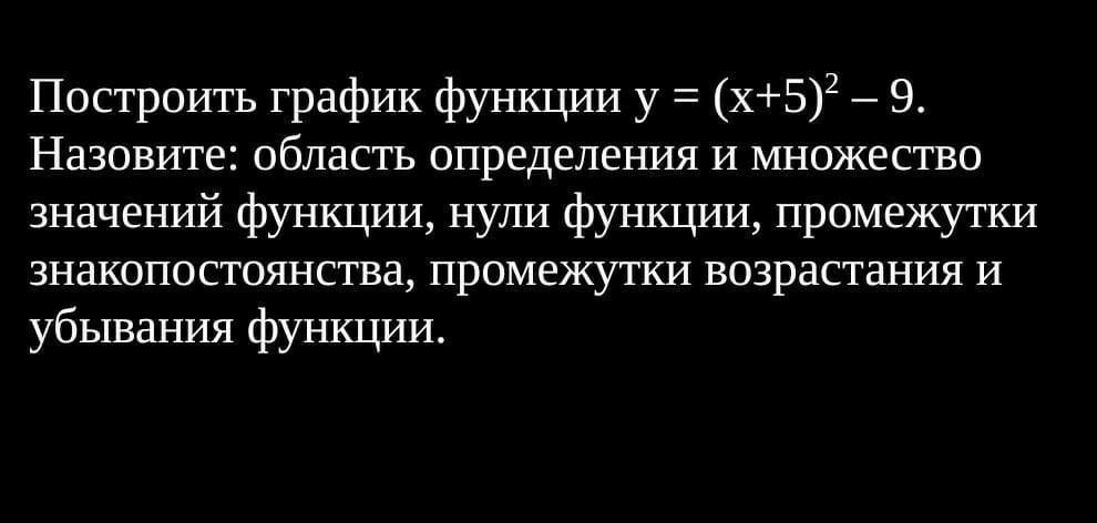 Построить график функции y = (x+5)^2-9. Назовите: область определения и множество значений функции, нули функции, промежутки знакопостоянства, промежутки Возрастания и убывания функции.