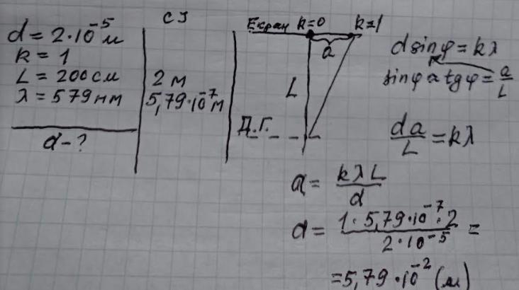 На каком расстоянии от середины центрального максимума решетки с периодом 2·10⁻⁵ м образуется первый дифракционный максимум, если расстояние от решетки до экрана 200 см, а длина световой волны 579 нм?