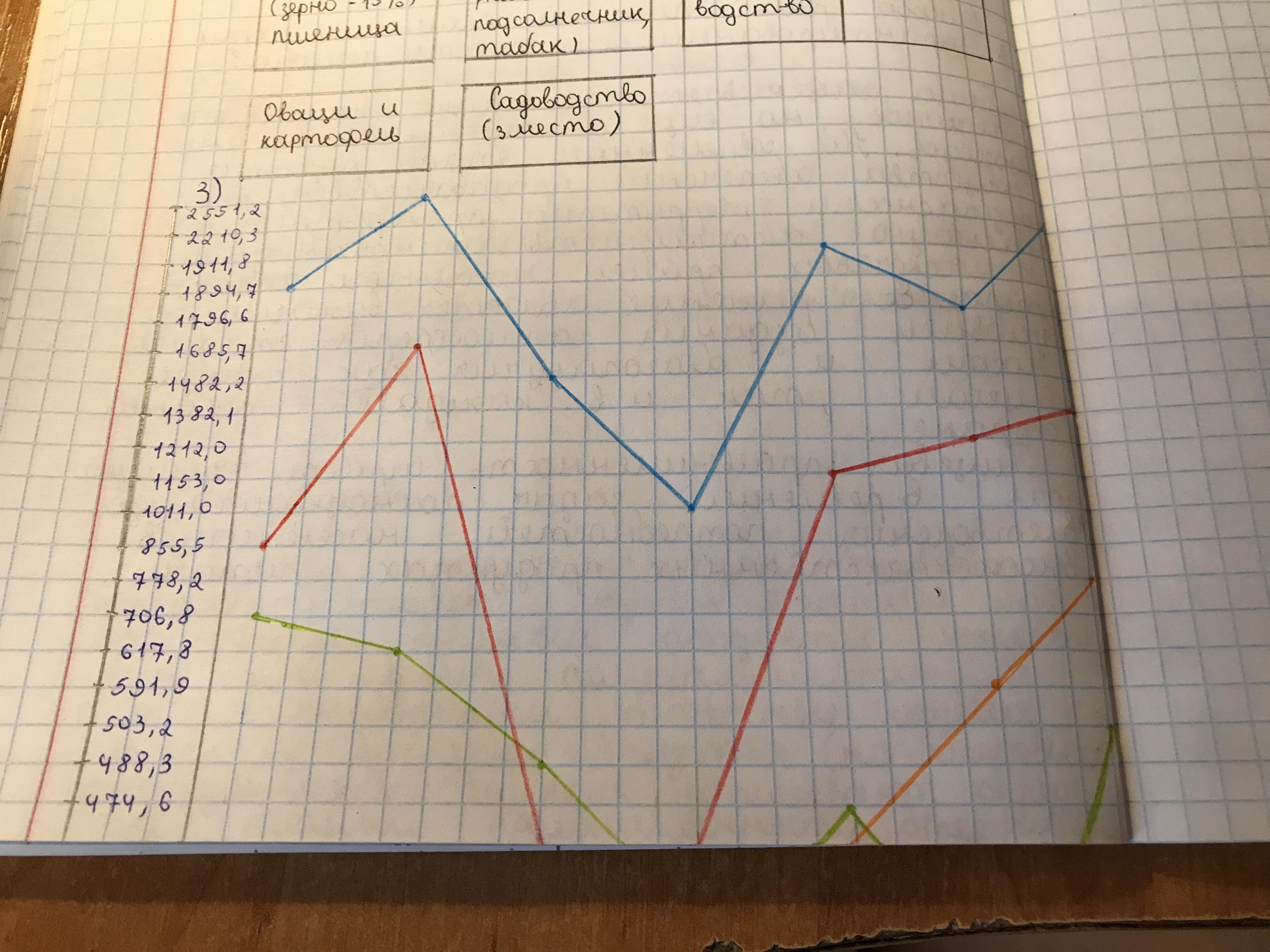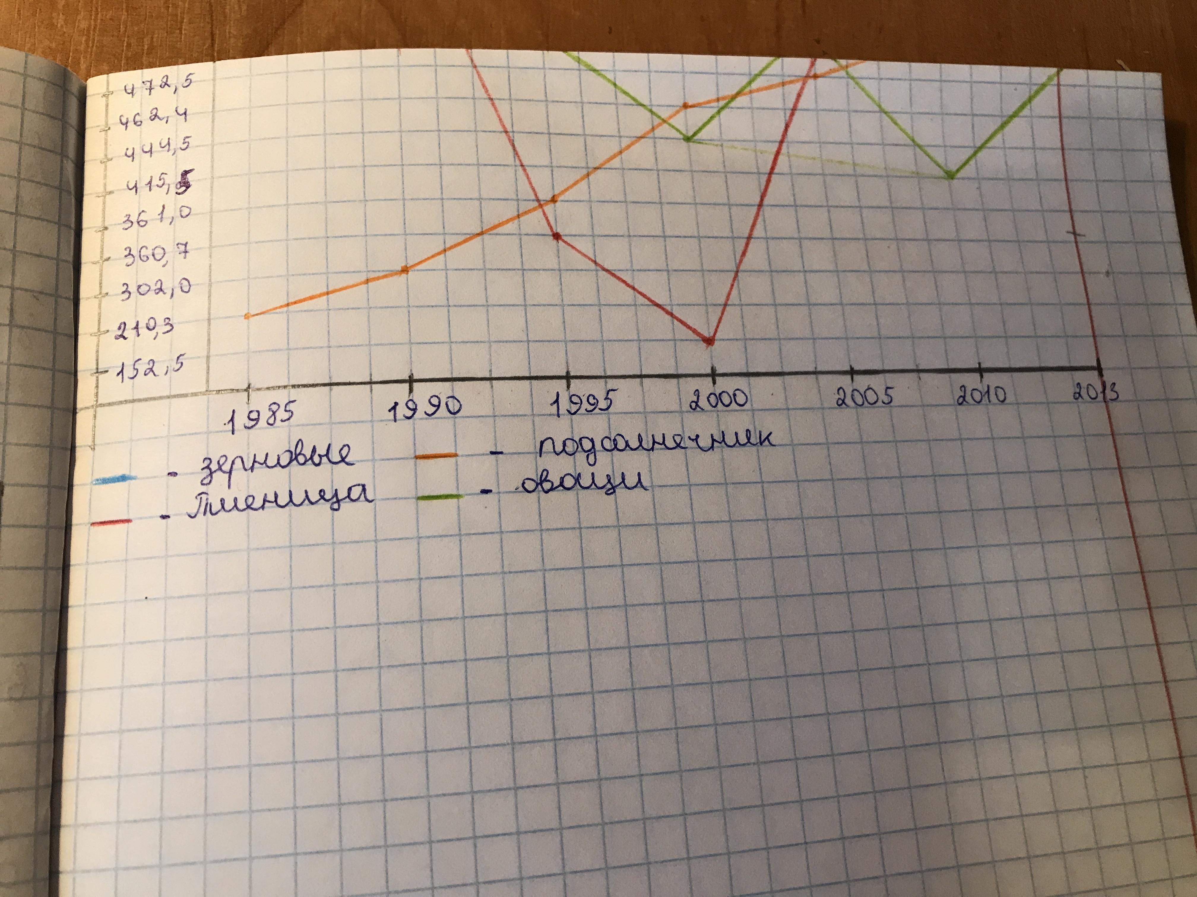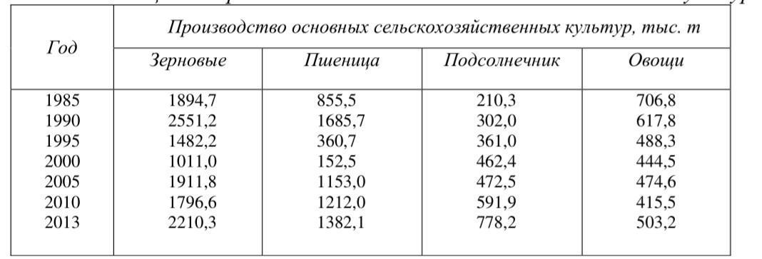 На основе сведений производства основных сельскохозяйственных культур в разные годы (табл. 1) постройте график, иллюстрирующий изменения этого показателя для одной из культур Сделайте вывод.
