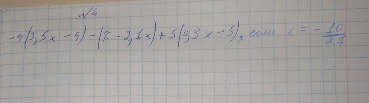 упростите выражение -4(3,5x-4)-(7-2,1x)+5(0,3x-5) и вычислите его значение при x=-10/27