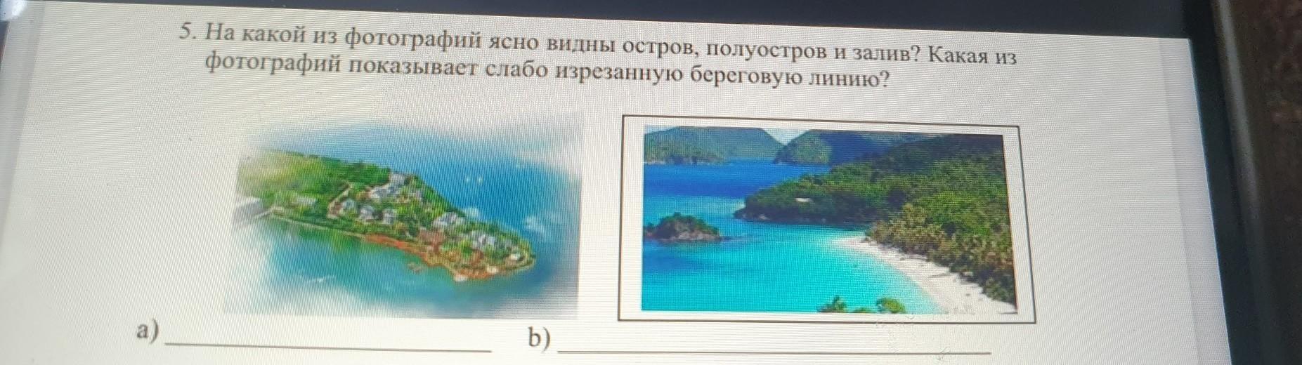 5. На какой из фотографий ясно видны остров, полуостров и залив? Какая из фотографий показывает слабо изрезанную береговую линию? а)