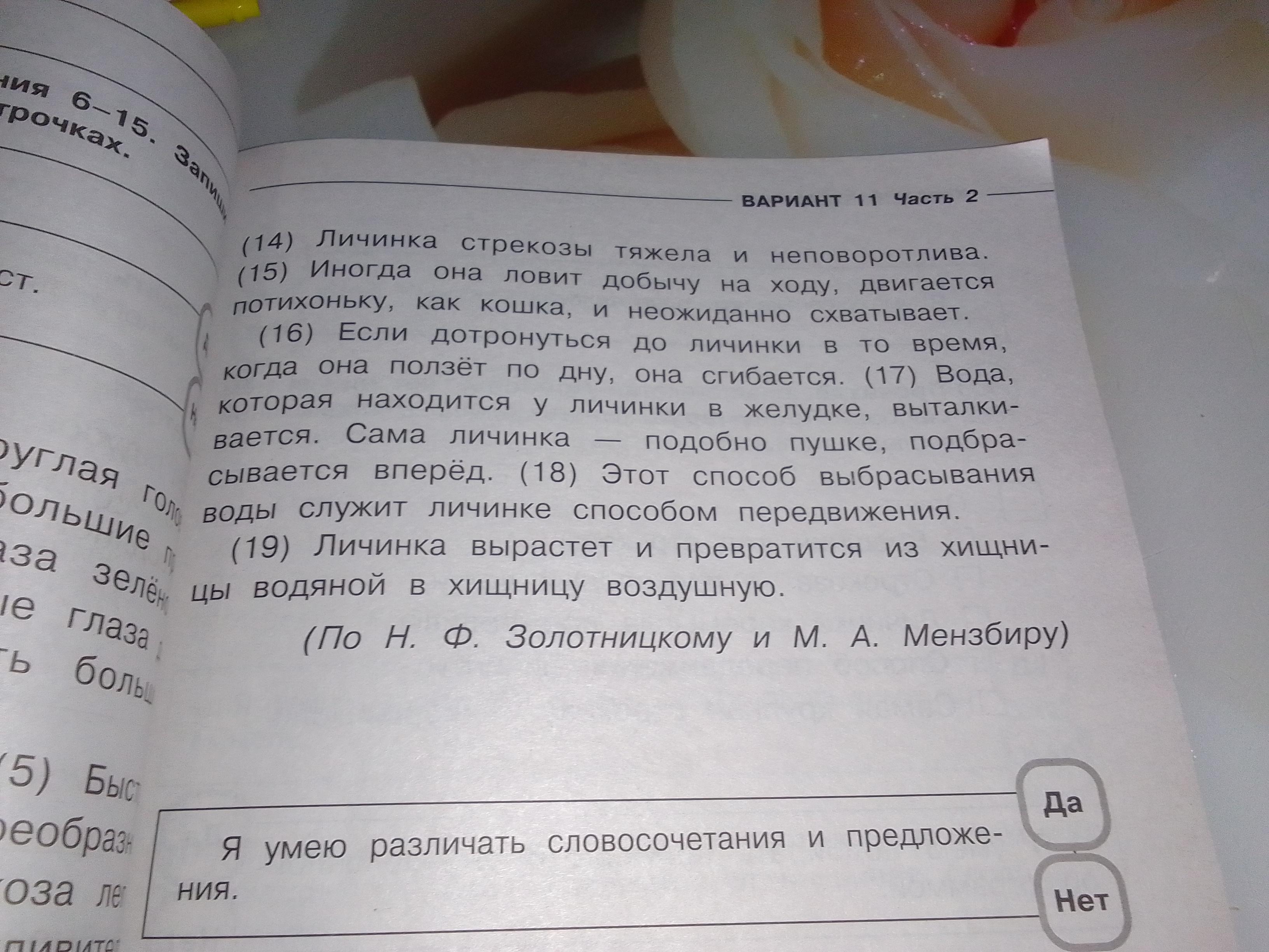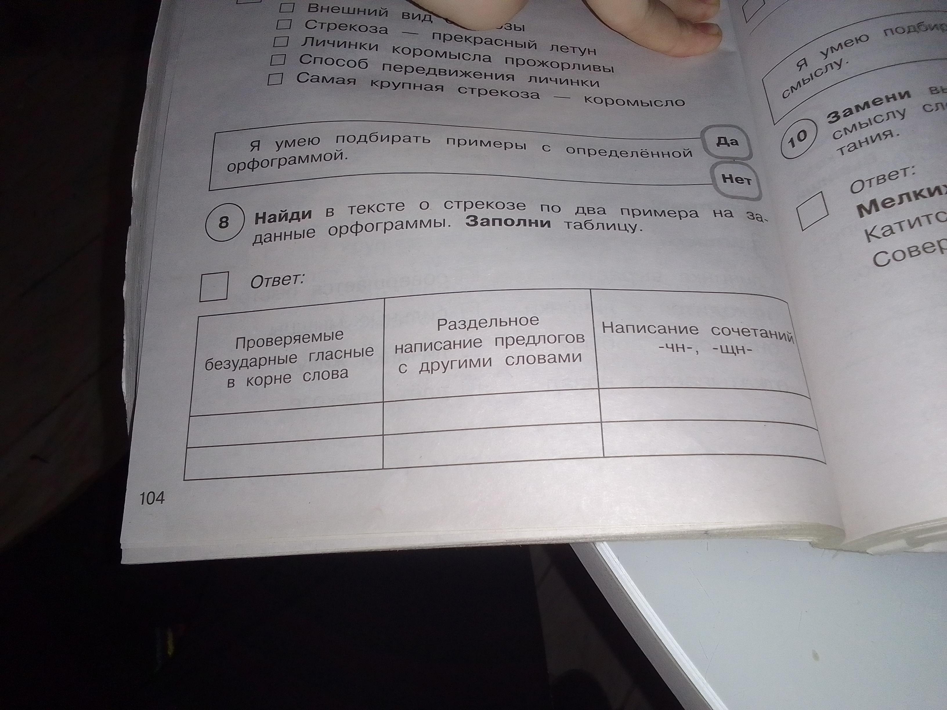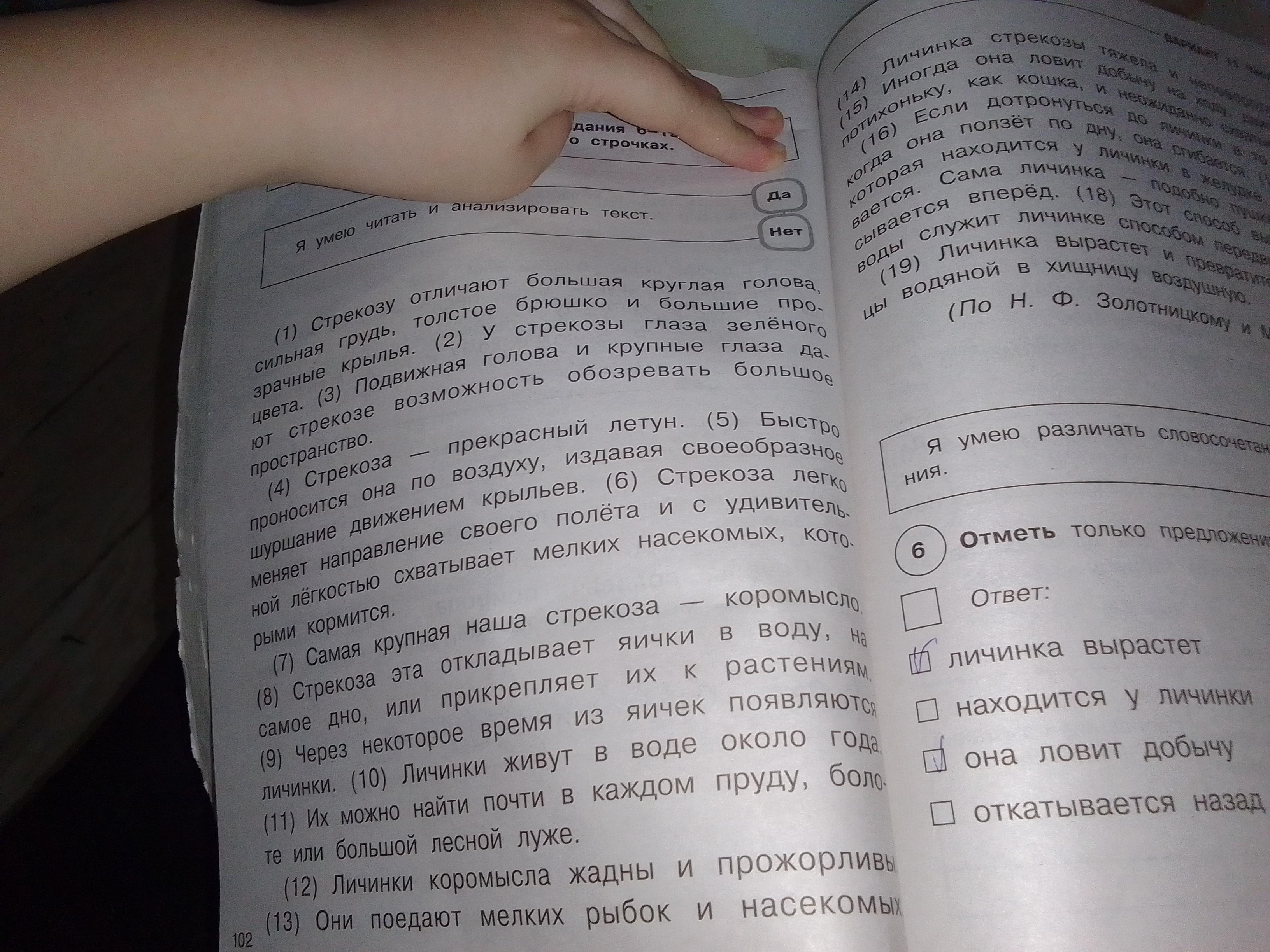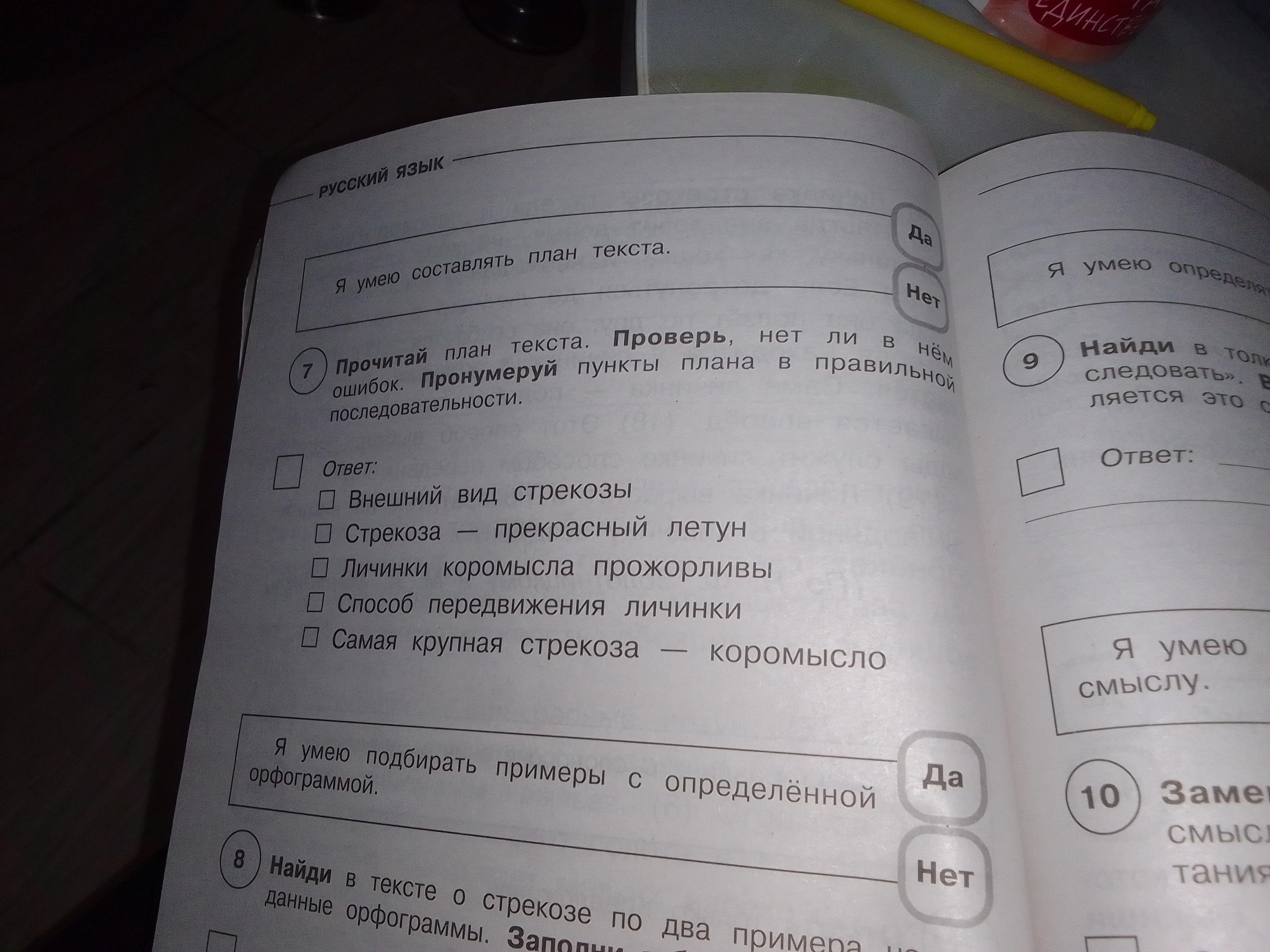 Ответ. Задание 7: ошибок вроде нет, план 1 - внешний вид стрекозы, 2 - стрекоза прекрасный летун, 3 - самая крупная стрекоза - коромысло, 4 - личинки коромысла прожорливы, 5 - способ передвижения личинки. Задание 8: проверяемые безударные гласные в корне слова - стрекозу (е/и), голова (о/а), раздельное написание предлогов с другими словами - (у)стрекозы, (в)воде, написание сочетаний -чн- , -щн- - из хищницы, прозрачные.