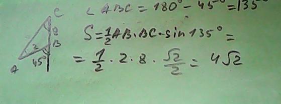 чему равна площадь треугольника ABC, если стороны AB и BC равны соответственно 2 и 8 см, а внешний угол при вершине B равен 45 градусов