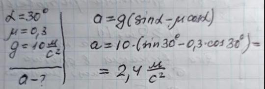 З яким прискоренням ковзає брусок по похилій площині з кутом нахилу 30° при коефіцієнті тертя 0,3?