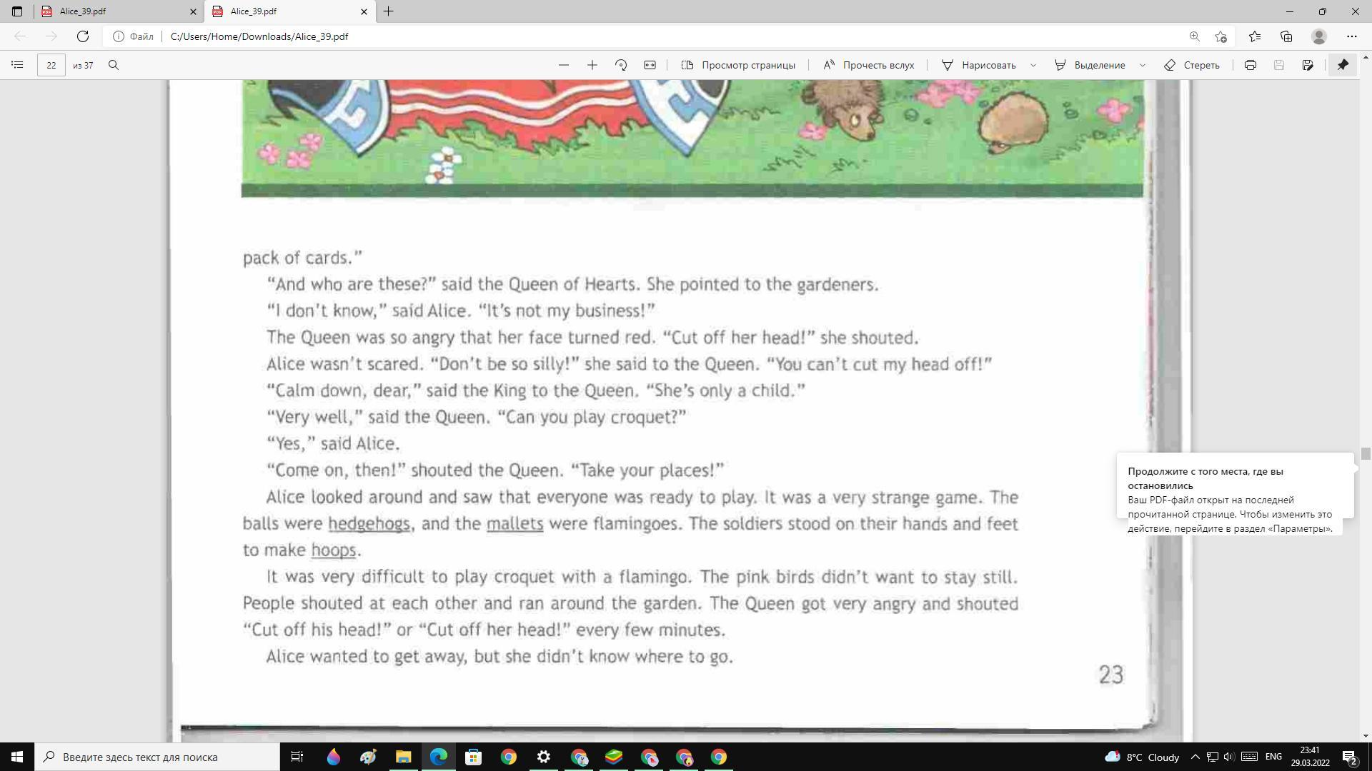 — А это кто? — сказала Королева червей. Она указала на садовников. — Не знаю, — сказала Алиса. "Это не мое дело!" Королева так рассердилась, что ее лицо покраснело. "Отрубить ей голову!" — крикнула она. Алиса не испугалась. "Не будь таким глупым!" — сказала она королеве. "Вы не можете отрезать мне голову!" — Успокойся, дорогая, — сказал Король Королеве. «Она всего лишь ребенок». — Очень хорошо, — сказала Королева. — Ты умеешь играть в крокет? — Да, — сказала Алиса. "Тогда пошли!" — крикнула Королева. "Займите свои места!" Алиса огляделась и увидела, что все готовы играть. Это была очень странная игра. Шарики были ёжиками, а молоточки — фламинго. Солдаты вставали на руки и ноги, чтобы сделать обручи. Было очень сложно играть в крокет с фламинго. Розовые птицы не хотели оставаться на месте. Люди кричали друг на друга и бегали по саду. Королева очень рассердилась и закричала: «Отрубите ему голову!» или "Отрубить ей голову!" каждые несколько минут. Алиса хотела уйти, но не знала, куда идти.