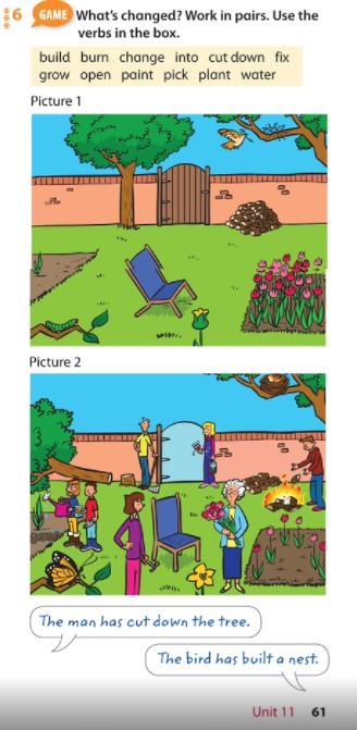 Что изменилось? Работать в парах. Используйте глаголы в рамке. строить сжечь изменить на срубить исправить вырастить открыть краску подобрать растение воду Рисунок. 2 Мужчина срубил дерево. Птица построила гнездо.