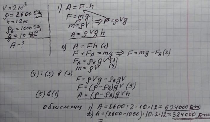 Яка робота виконується під час підйому гранітної плити об'ємом 2 м у кубі на висоту 12 метрів? чому дорівнюватиме робота, якщо цю плиту піднімати на ту ж висоту у воді?