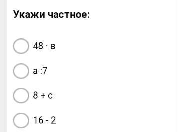 Сначала нам нужно разобраться, что такое частое. Вспомнив, понимает что есть формула делимое:делитель= частное. Значит, нам нужно искать из всего это деление. Среди всего здесь одно , значит ответ а:7