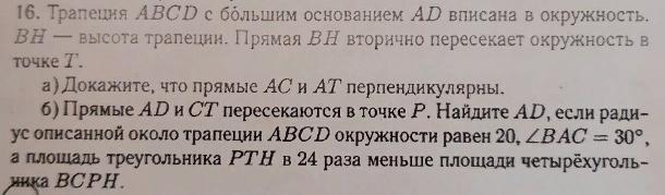 Трапеция ABCD с большим основанием AD и высотой BH вписана в окружность. Прямая BH вторично пересекает эту окружность в точке Т.