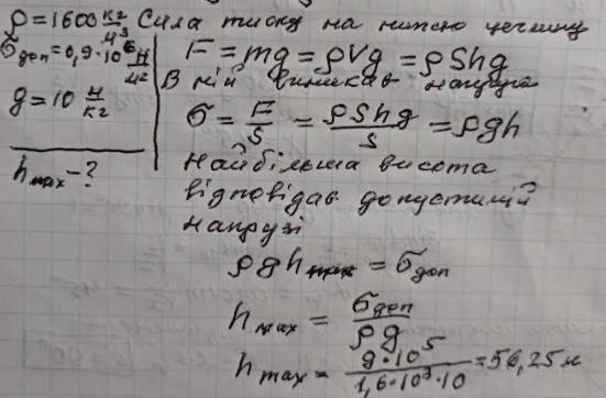 Допоможіть,будь ласка , розв'язати розгорнуто задачу . Якої найбільшої висоти може бути цегляна споруда, якщо допустима напруга цегляної кладки сигма=0,9•10^6 н/м^2?