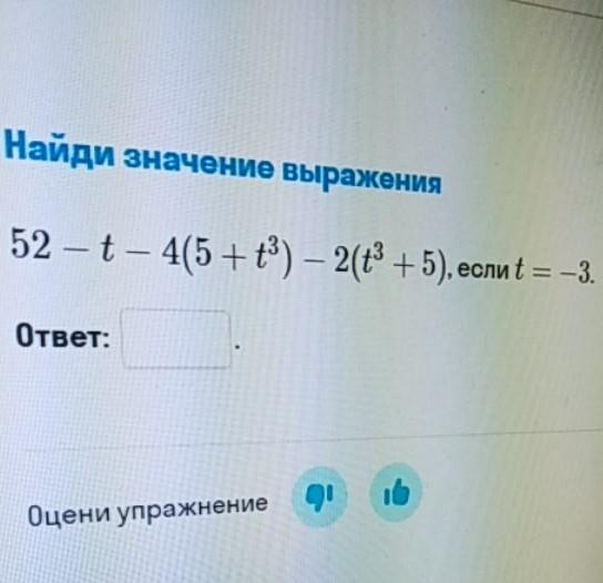 А=52-t-6(t³+5), при t= -3, 52-t-6(t³+5)=52+3 -6(-27+5)=55-6(-22)=55+132=