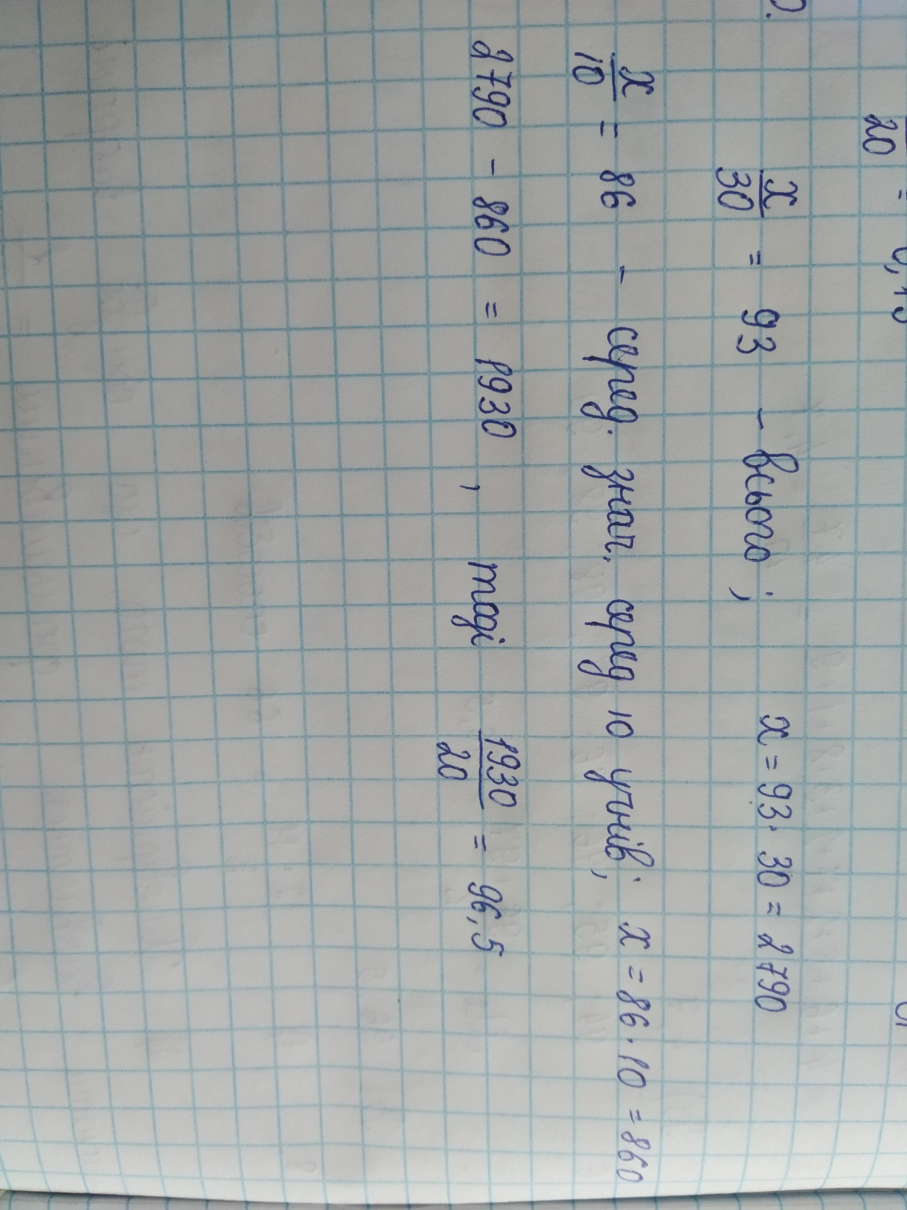 Учні 11-го класу проходили тестування з української мови, під час якого оцінку виставляли за 100-бальною шкалою. Середне значення оцінок 10 перших за списком учнів цього класу дорівнює 86 балів. Знайдіть середне значення оцінок решти 20 учнів цього класу, якщо середне значення оцінок усіх 30 учнів класу становить 93 бали.