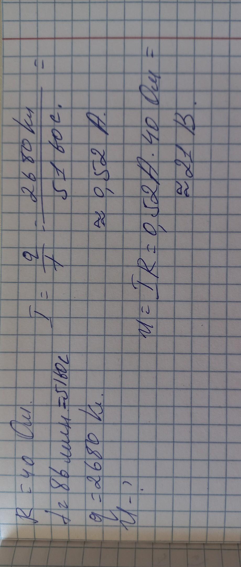 Определите напряжение на концах проводника, если его сопротивление равно 40 Ом, и известно, что за 86 мин через его поперечное сечение проходит заряд равный 2680 Кл.