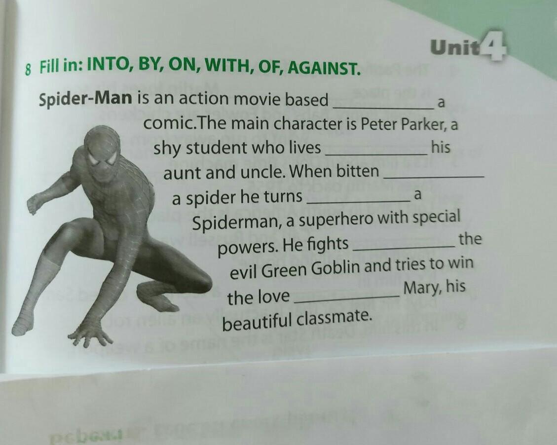Spider-Man is an action movie based on a comic. The main character is Peter Parker, a shy student who lives with his aunt and uncle. When bitten by a spider he turns into a Spiderman, a superhero with special powers. He fights against the evil Green Goblin and tries to win the love of Mary, his beautiful classmate