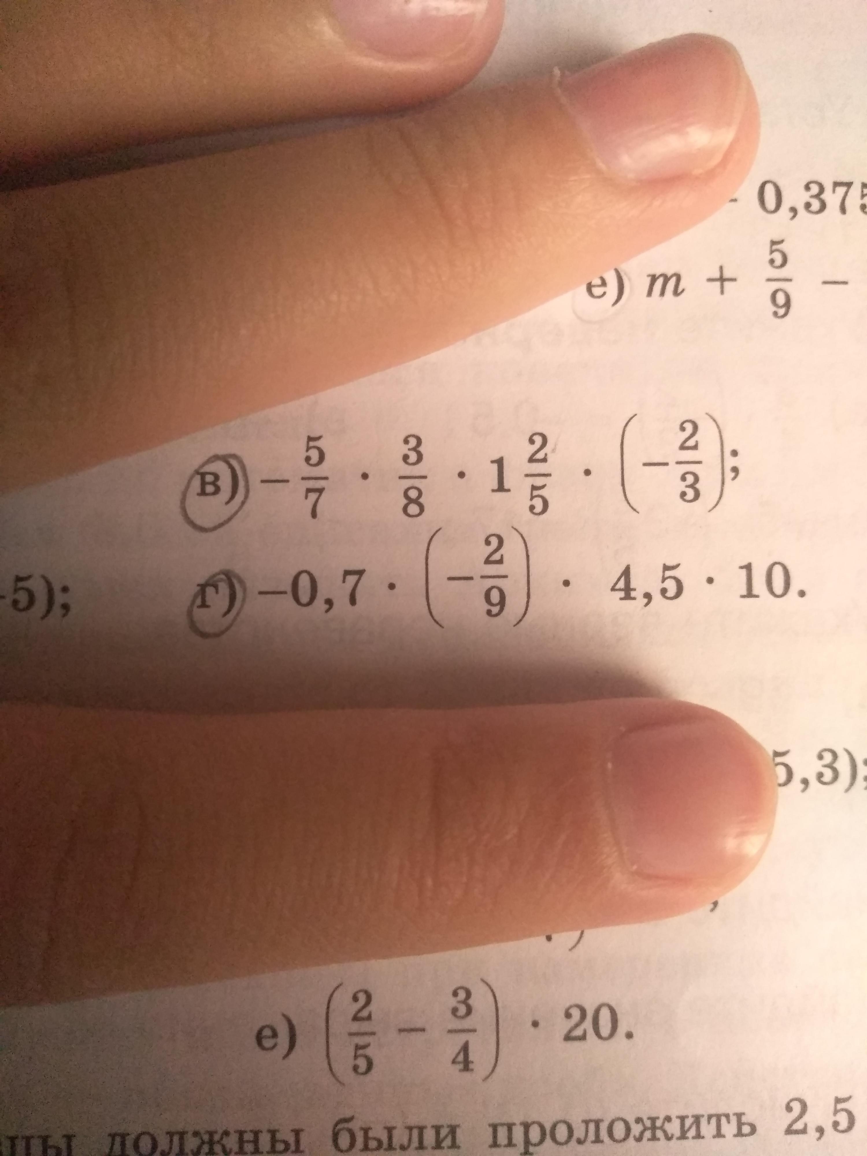 в) -5/7*3/8*1 2/5*(-2/3)= (-5/7)*3/8*(14/15)=(-5/7)*(-7/20)=1/4