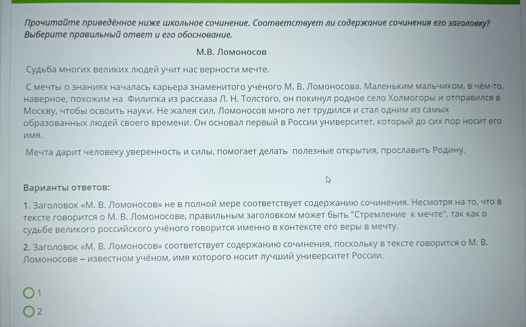 Прочитайте приведённое ниже школьное сочинение. Соответствует ли содержание сочинения его заголовку? Выберите правильный ответ и его обоснование. М.В. Ломоносов Судьба многих великих людей учит нас верности мечте. С мечты о знаниях началась карьера знаменитого учёного М. В. Ломоносова. Маленьким мальчиком, в чём-то, наверное, похожим на Филипка из рассказа Л. Н. Толстого, он покинул родное село Холмогоры и отправился в Москву, чтобы освоить науки. Не жалея сил, Ломоносов много лет трудился и стал одним из самых образованных людей своего времени. Он основал первый в России университет, который до сих пор носит его ИМЯ. Мечта дарит человеку уверенность и силы, помогает делать полезные открытия, прославить Родину. Варианты ответов: 1. Заголовок «М. В. Ломоносов» не в полной мере соответствует содержанию сочинения. Несмотря на то, что в тексте говорится о М. В. Ломоносове, правильным заголовком может быть "Стремление к мечте", так как о судьбе великого российского учёного говорится именно в контексте его веры в мечту. 2. Заголовок «М. В. Ломоносов» соответствует содержанию сочинения, поскольку в тексте говорится о М. В. Ломоносове известном учёном, имя которого носит лучший университет России.