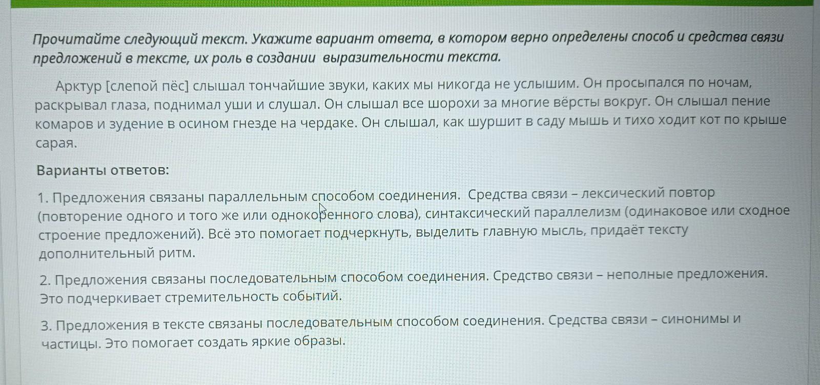 Прочитайте следующий текст. Укажите вариант ответа, в котором верно определены способ и средства связи предложений в тексте, их роль в создании выразительности текста, Арктур [слепой пёс] слышал тончайшие звуки, каких мы никогда не услышим. Он просыпался по ночам, раскрывал глаза, поднимал уши и слушал. Он слышал все шорохи за многие вёрсты вокруг. Он слышал пение комаров и зудение в осином гнезде на чердаке, он слышал, как шуршит в саду мышь и тихо ходит кот по крыше сарая. B Варианты ответов: 1. Предложения связаны параллельным способом соединения. Средства связи - лексический повтор (повторение одного и того же или однокоренного слова), синтаксический параллелизм (одинаковое или сходное строение предложений). Всё это помогает подчеркнуть, выделить главную мысль, придаёт тексту дополнительный ритм. 2. Предложения связаны последовательным способом соединения. Средство связи - неполные предложения. Это подчеркивает стремительность событий. 3. Предложения в тексте связаны последовательным способом соединения. Средства связи частицы. Это помогает создать яркие образы, синонимы и