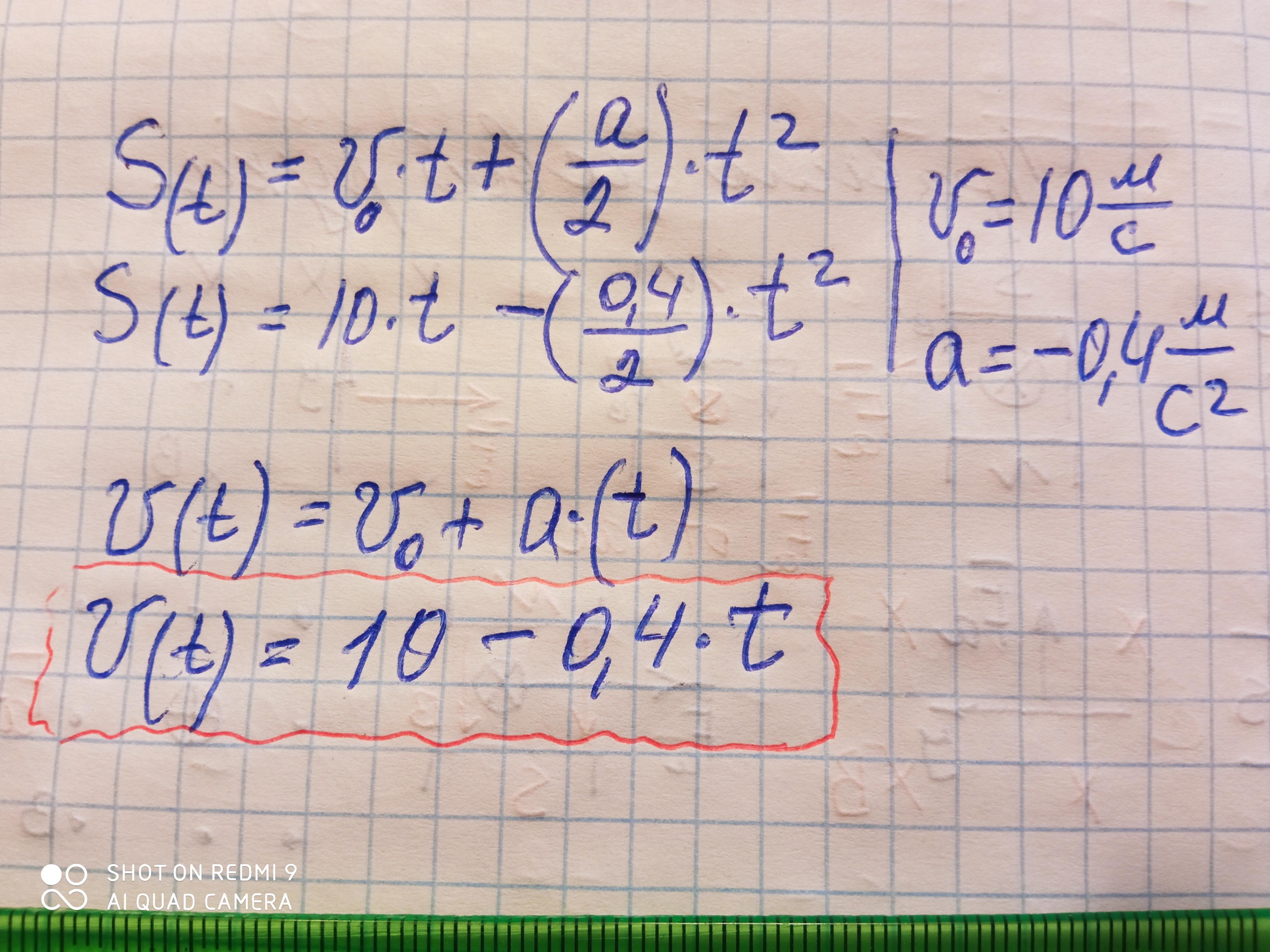 Рівняння переміщення мотоцикліста має вигляд s=10t-0,2t^2. Написати формулу залежності щвидкості мотоцикліста від часу