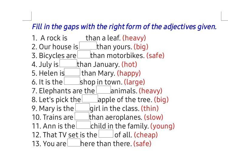 Fill in the gaps with the right form of the adjectives given. 1. A rock is than a leaf. (heavy) 2. Our house is than yours. (big) 3. Bicycles are than motorbikes. (safe) 4. July is than January. (hot) 5. Helen is than Mary. (happy) 6. It is the shop in town. (large) 7. Elephants are the Janimals. (heavy) 8. Let's pick the Japple of the tree. (big) 9. Mary is the girl in the class. (thin) 10. Trains are than aeroplanes. (slow) 11. Ann is the Ichild in the family. (young) 12. That TV set is the Jof all. (cheap) 13. You are here than there. (safe)