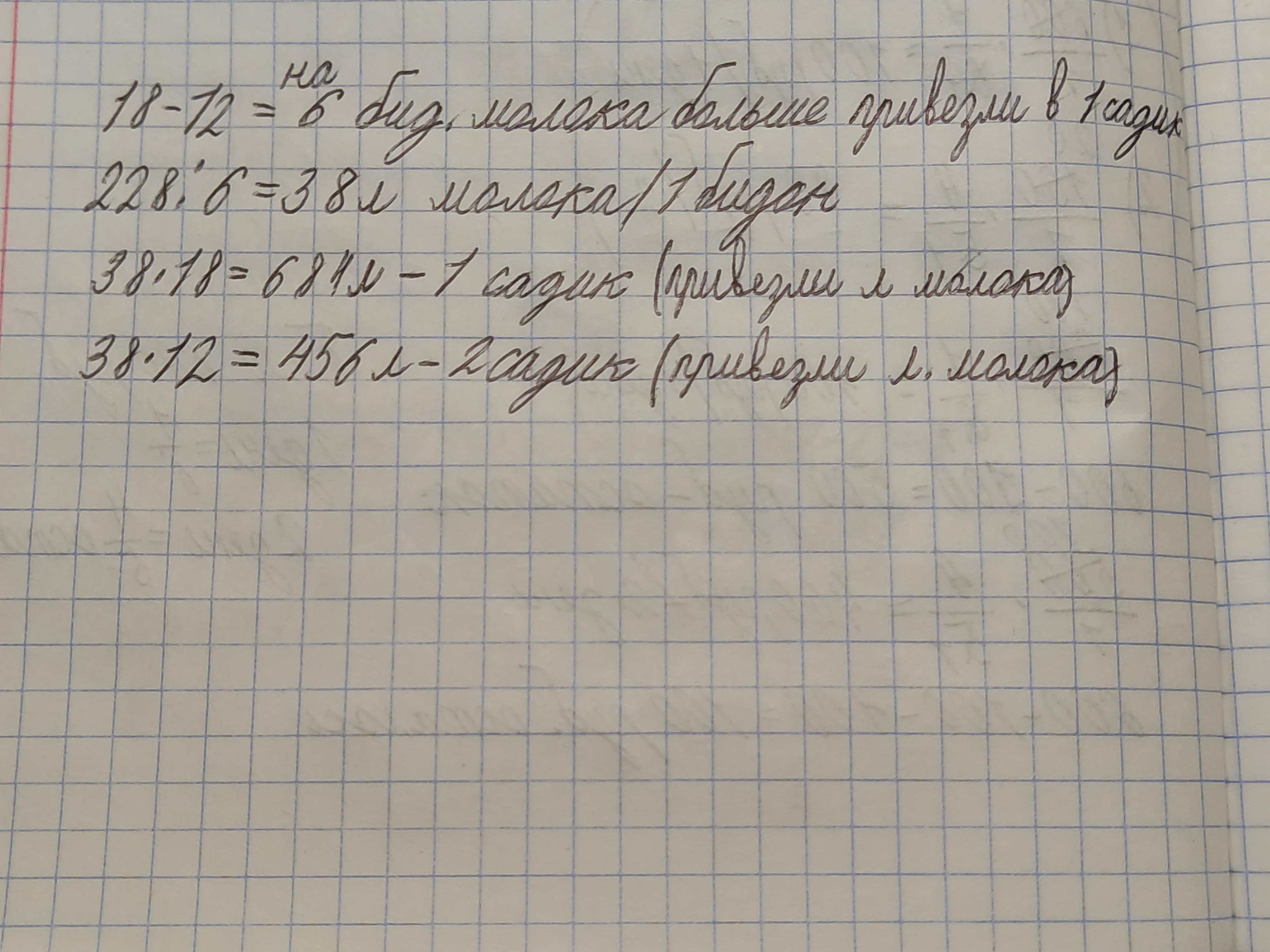 1)18-12=6 бидонов,на столько больше привезли в первый садик