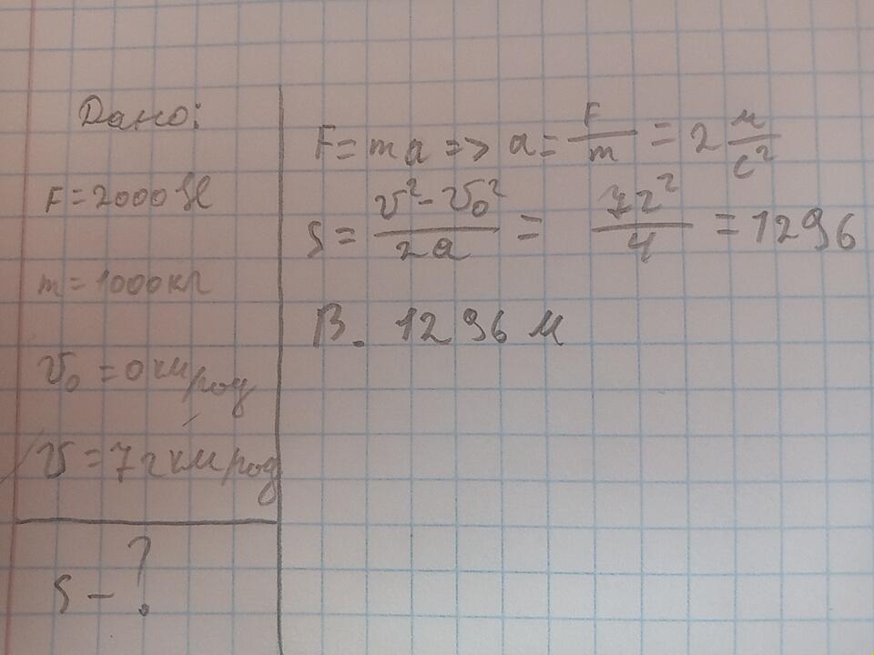 Срочно решите задачу!!! Желательно с дано : Сила тяги двигуна 2kh. На якій видстані автомобиль мама якого 1т розганяється від старту до 72 км/год