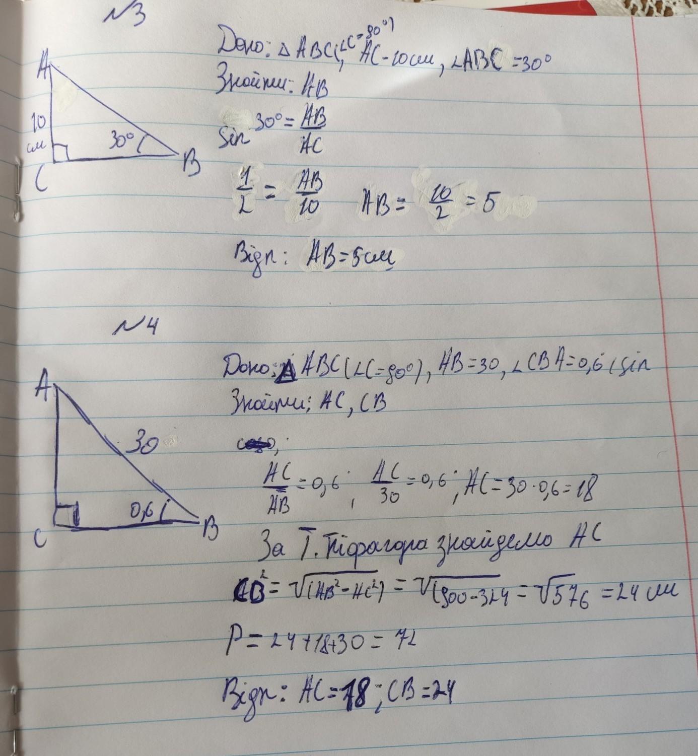 4. У прямокутному трикутнику гіпотенуза дорівнює 30 см, а синус одного з кутів — 0,6. Знайдіть катети трикутника