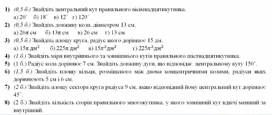 7) 2 б.) Знайдіть площу сектора круга радіуса 9 см, якщо відповідний йому центральний кут дорівнює