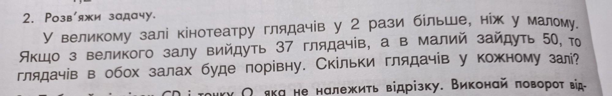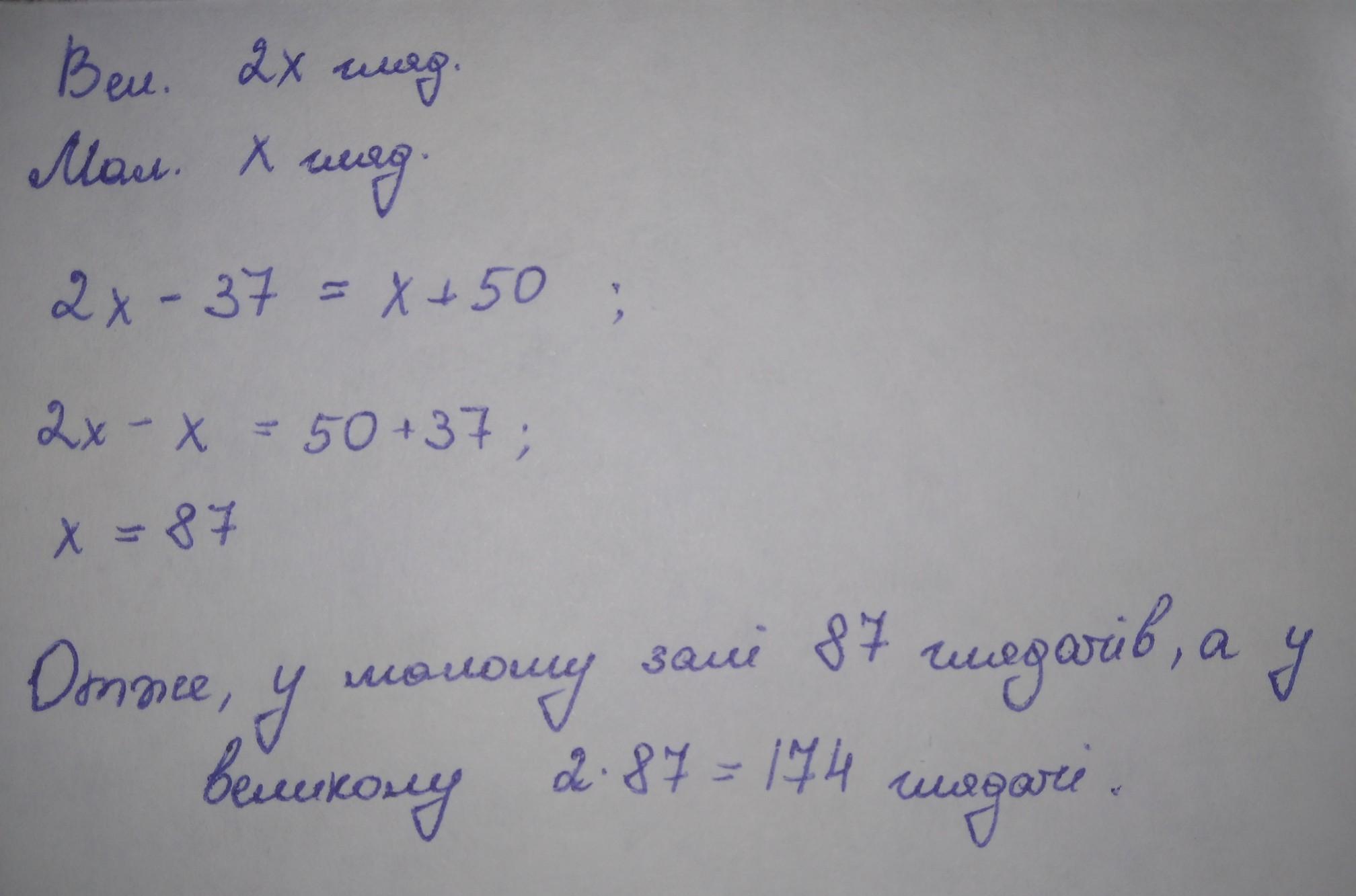 х+50=2х-37, х=87 зрителей в малом зале, 87+50=137 зрителей в большом зале