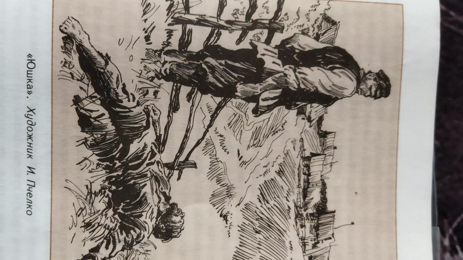 На иллюстрации можно увидеть, как прохожий, как обычно напавший было на Юшку с издевками, настолько осерчал, что убил последнего.