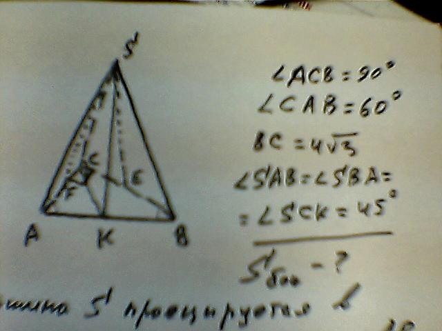 основание пирамиды - прямоугольный треугольник с катетом 4*корень 3 см и противолежащим углом 60 градусов. все боковые рёбра пирамиды наклонены к плоскости основания под углом 45 градусов. найти площадь боковой поверхности пирамиды