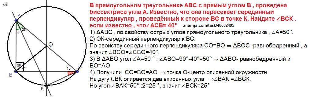 В прямоугольном треугольнике АВС с прямым углом В , проведена биссектриса угла А. Известно, что она пересекает серединный перпендикуляр , проведённый к стороне ВС в точке К. Найдите угол ВСК , если известно , что∠АСВ= 40°