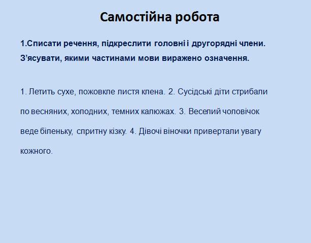 3. Означення (прикметник), підмет, присудок, ( означення, означення — прикметники), додаток.