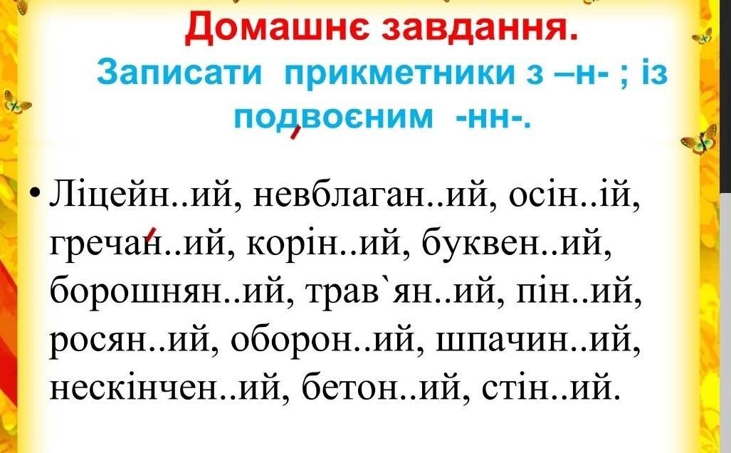 Ліцейний, невблаганний,осінній,гречаний, корінний, буквений, борошняний,трав'яний, пінний, росяний, оборонний, шпачиний, нескінченний, бетонний, стінний.