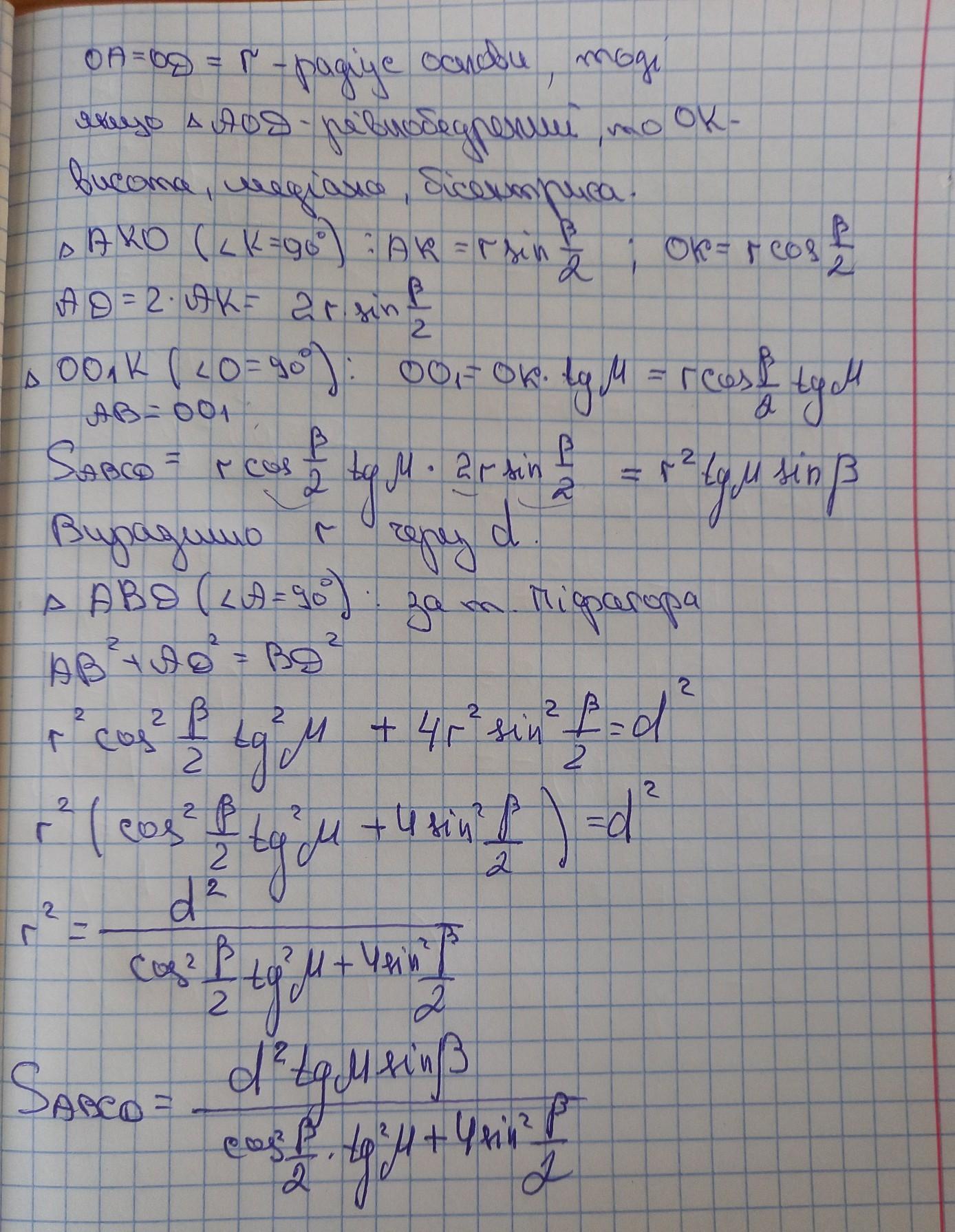хорді, яку видно із центра цієї основи під кутом β. Відрізок, який сполучає центр верхньої
