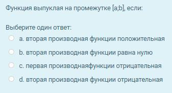 Пусть функция f ( x ) дважды дифференцируема ( имеет вторую производную ) на интервале ( a, b ), тогда если f '' ( x ) < 0 для любого x ( a, b ), то функция f ( x ) является выпуклой на интервале ( a, b ) .