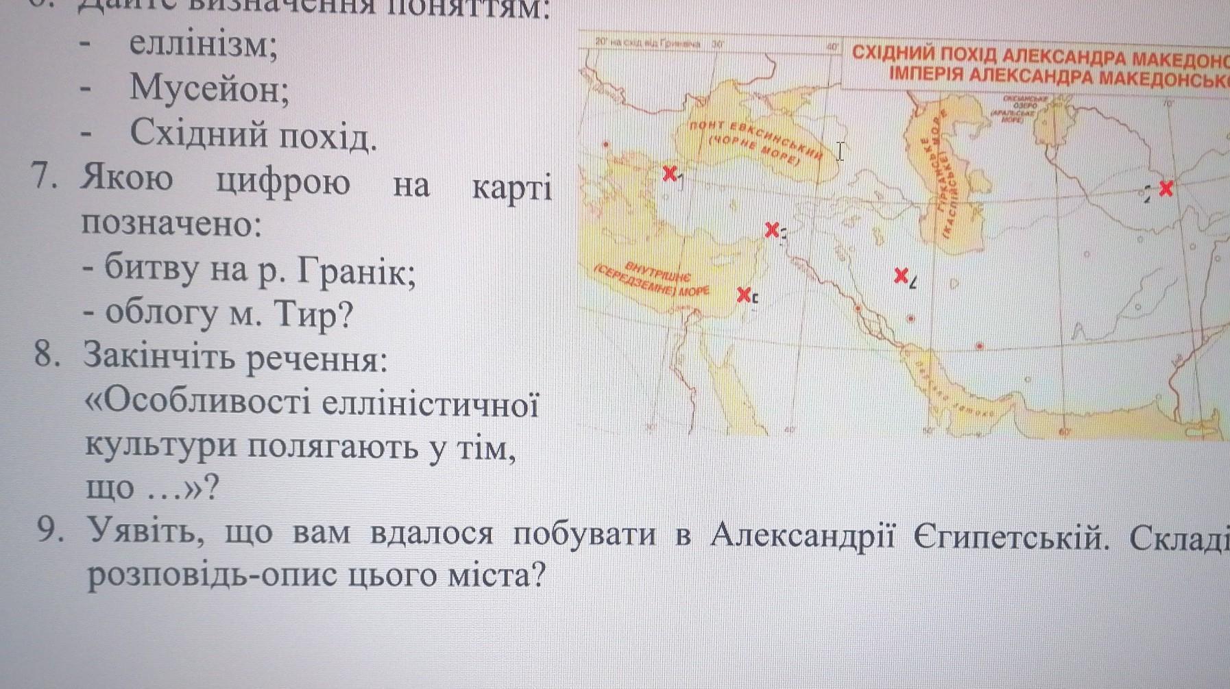 8."Особливості еллінічтичної культури полягають у тім, що в ній поєднались одночасно грецька і східна культура. Грецькі досягнення йшли на Схід, а звідти до Еллінського Пантеону долучились нові божества."
